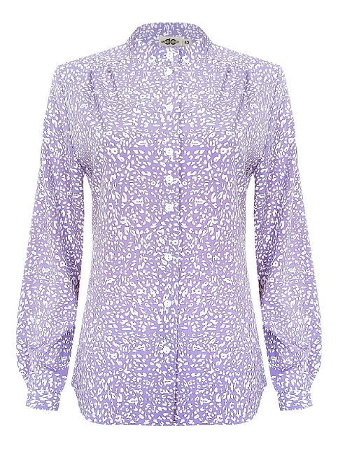 Нарядная блуза в нежно-лавандовом оттенке с мелким белоснежным рисунком из шелковистой поливискозной ткани, средняя длина, приталенная, воротник стойка, по цельнокроенной кокетке спереди заложены мягкие складки, застежка на пуговицы, длинный втачной рукав на  манжете с функциональной петлей и пуговицей. Благодаря своему составу удобна в носке и проста в уходе.