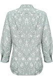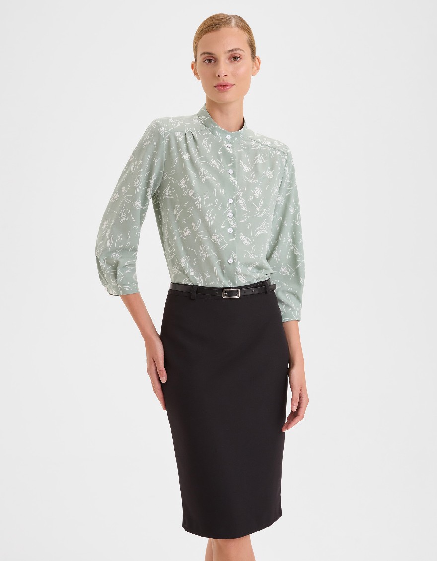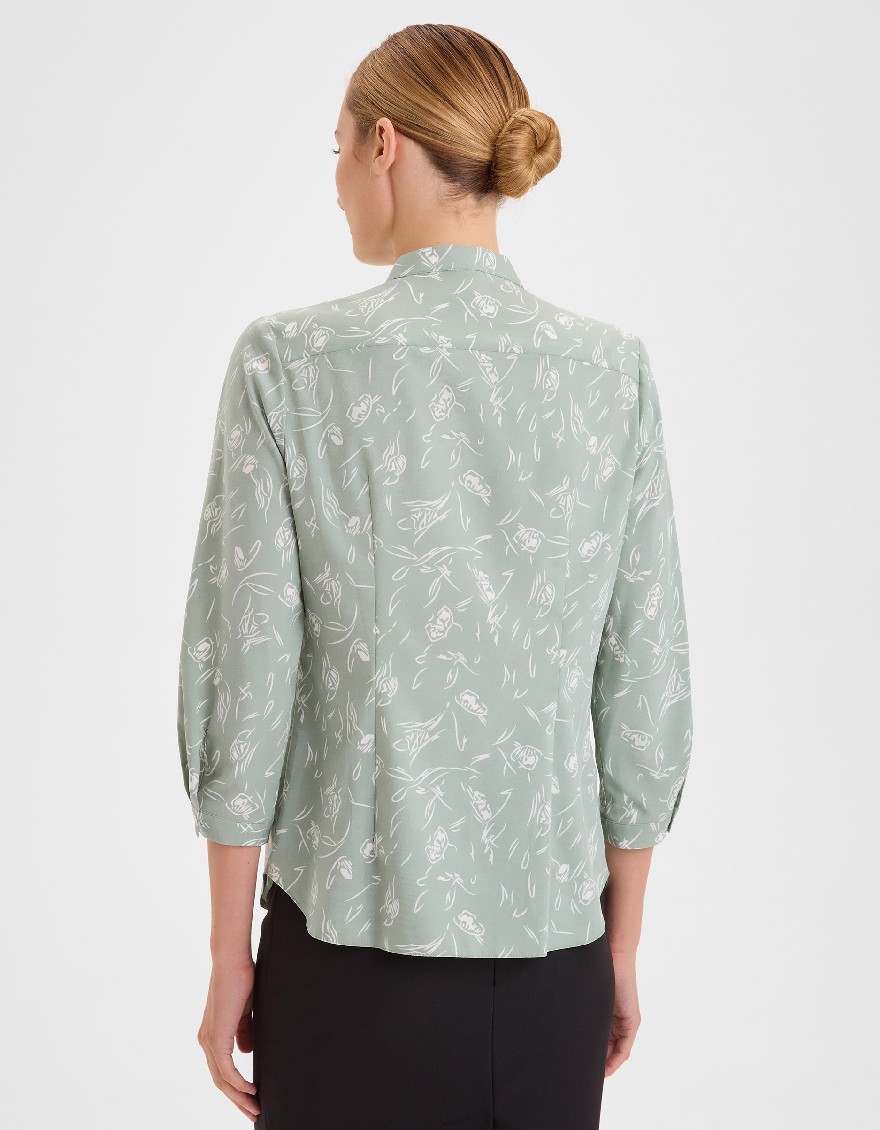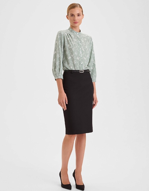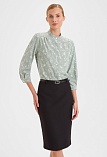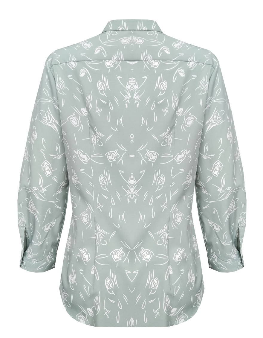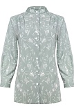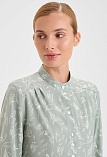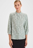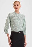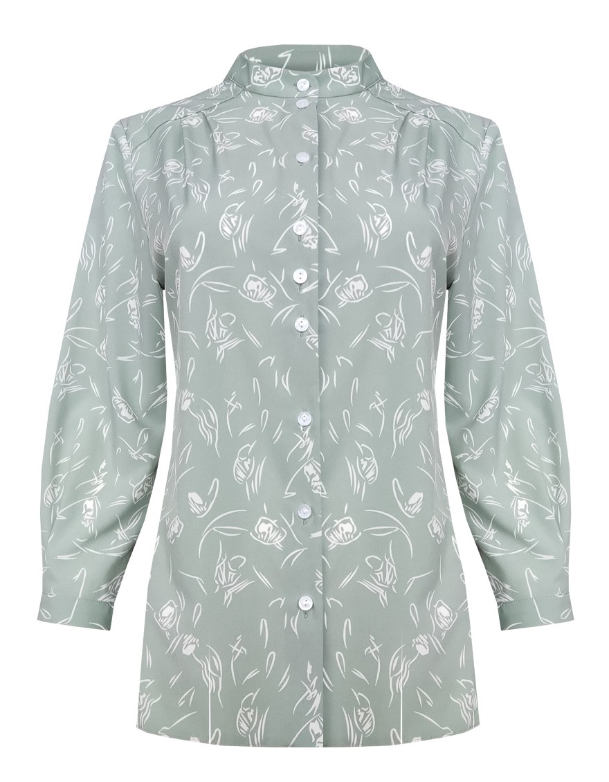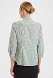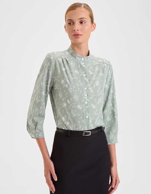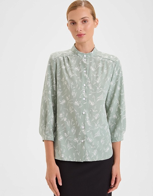 Элегантная блуза в нежно-мятном цвете из шелковистой поливискозной ткани с абстрактным растительным рисунком, средняя длина, приталенная, воротник стойка, по цельнокроеной кокетке спереди заложены мягкие складки, застежка на пуговицы, длина рукава 3/4 на манжете с функциональной петлей и пуговицей.