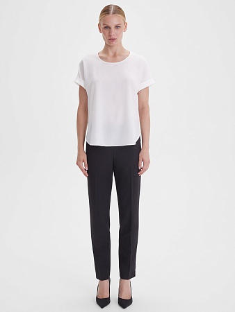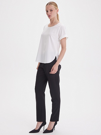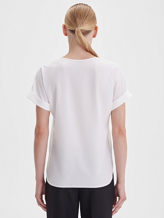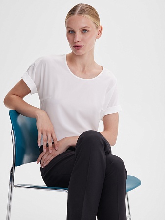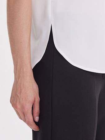 Универсальная блуза молочного цвета из мягкой и легкой поливискозной ткани,  ткань приятная на ощупь, долговечна и неприхотлива в уходе, средняя длина, приталенный силуэт, V-образная горловина с цельнокроенным воротником и застроченными складками от плеча, застежка на мелкие пуговицы в цвет ткани, втачной рукав длиной 3/4 на манжете, подойдет для любого типа фигуры
