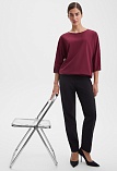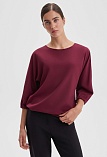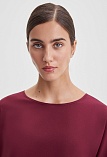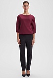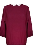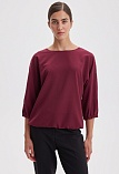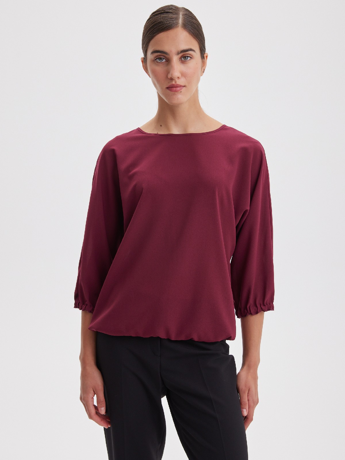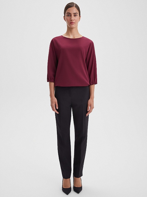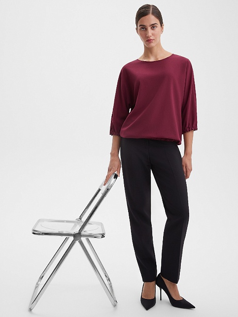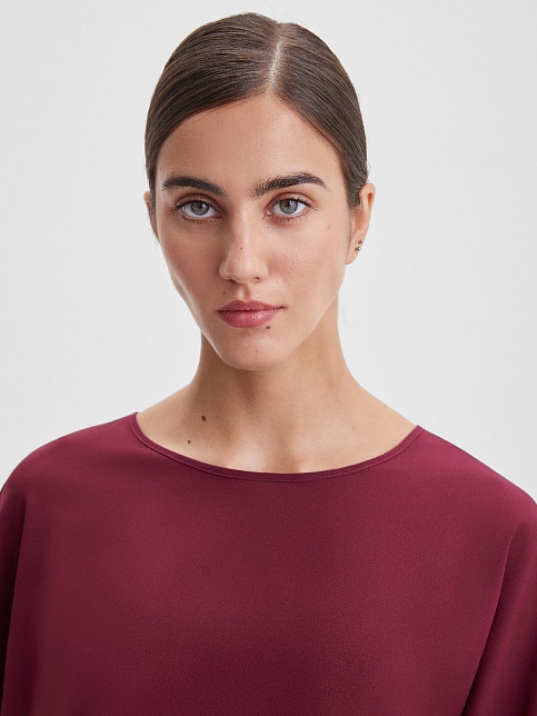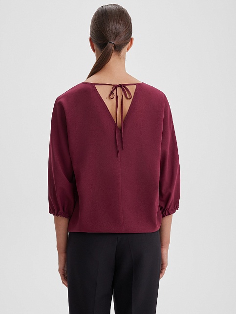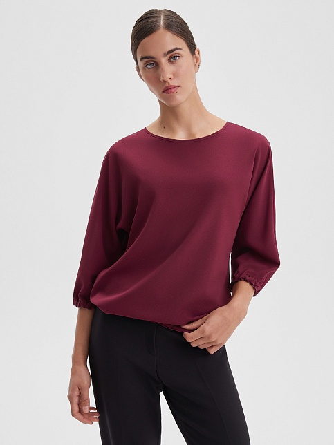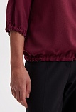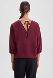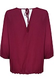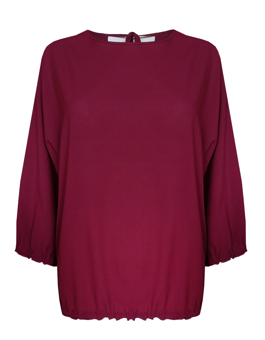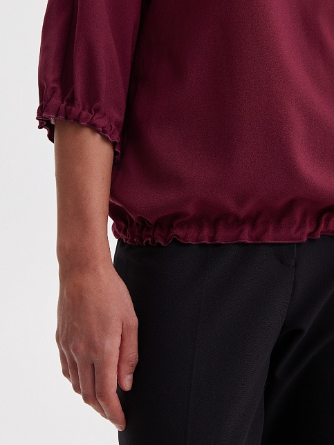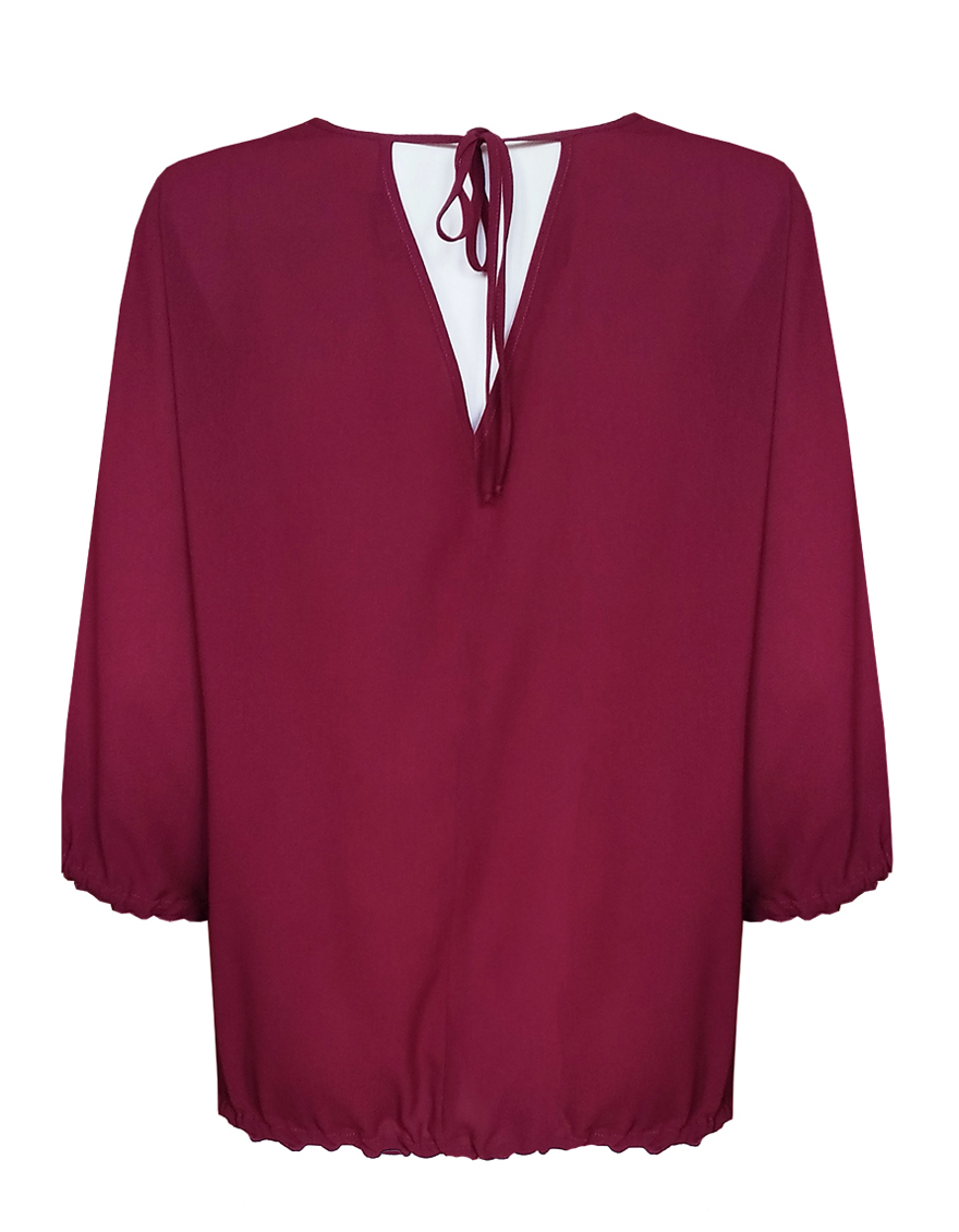 Блуза цвета бордо из струящейся вискозной ткани, свободный крой дарит максимальную свободу движений и комфорт, средняя длина, V-образный вырез на спинке и круглый вырез по переду обработаны узким кантом, переходящий в завязки на спинке, такой необычный вырез поможет удлинить линию шеи и создать сбалансированный образ, цельнокроеные рукава 3/4, низ изделия и рукавов присборены на эластичную резинку, что придает удобство в носке и не привязывает изделие к определенному объему бедер и обхвату руки