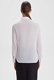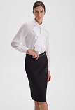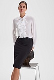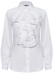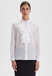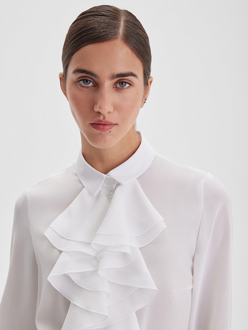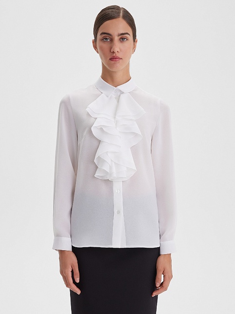 Изысканная блузка из полупрозрачной шифоновой ткани в ярком оттенке белого с ноткой кремового тепла, приталенная, средняя длина, отложной рубашечный воротник, от горловины к поясу спускается оборка, которая создает декоративный элемент и относится к разновидности воротника жабо, оно визуально удлиняет шею и делает образ более утонченным, застежка на мелкие пуговицы, длинный втачной рукав на манжете с функциональной петлей и пуговицей.