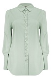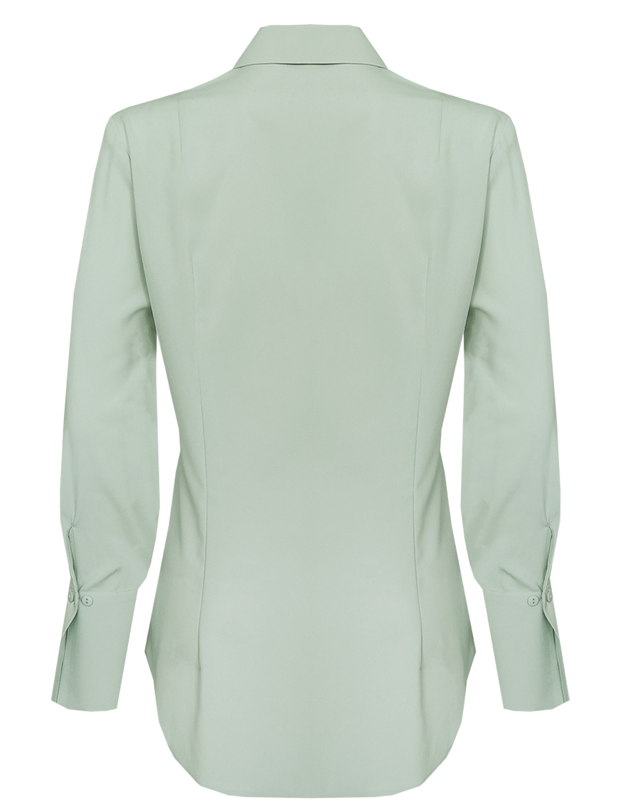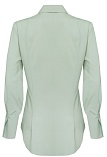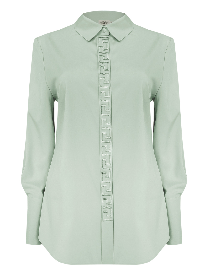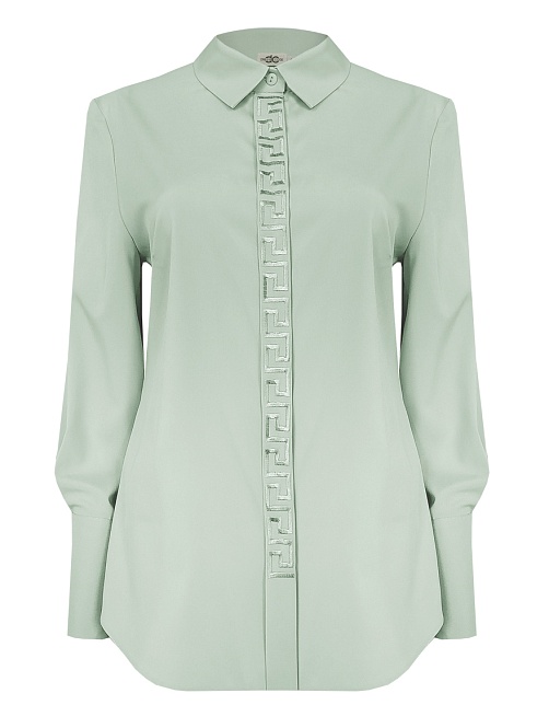 Нежная блуза в приглушенном пастельно-зеленом цвете из струящейся поливискозной ткани украшена знаковым Меандровым узором, который воплотился в вышивке по планке, вид застежки  супатная -  внутренняя застежка на пуговицы, которые спрятаны между слоями ткани и не видны, приталенный силуэт за счет вытачек по спинке, рубашечный отложной воротник, модель удлиненная с фигурным низом, что позволяет носить ее навыпуск или под ремень, длинный втачной рукав с  высоким манжетом и застежкой на пуговицу.