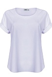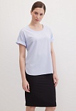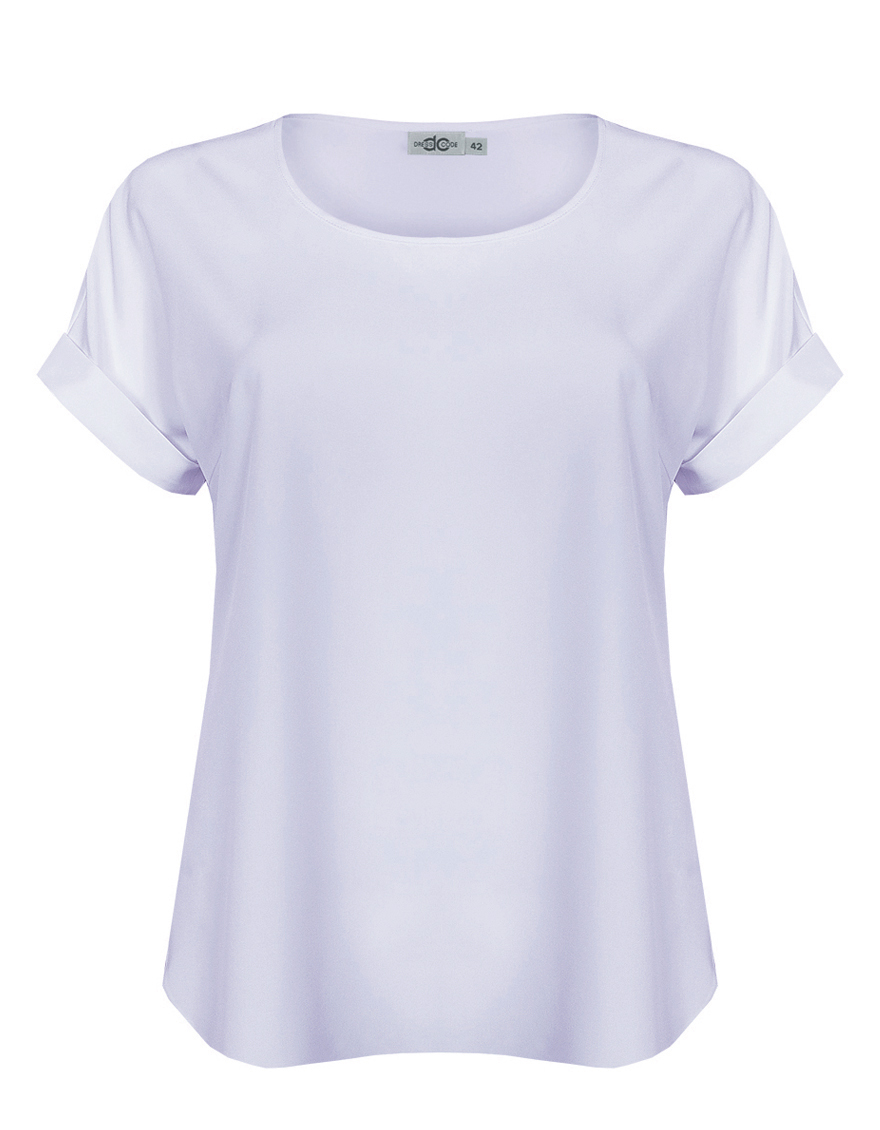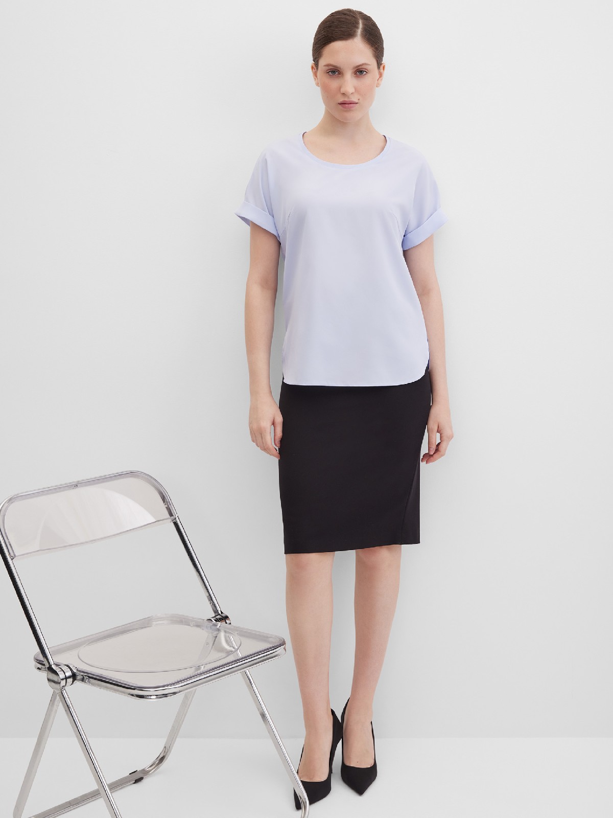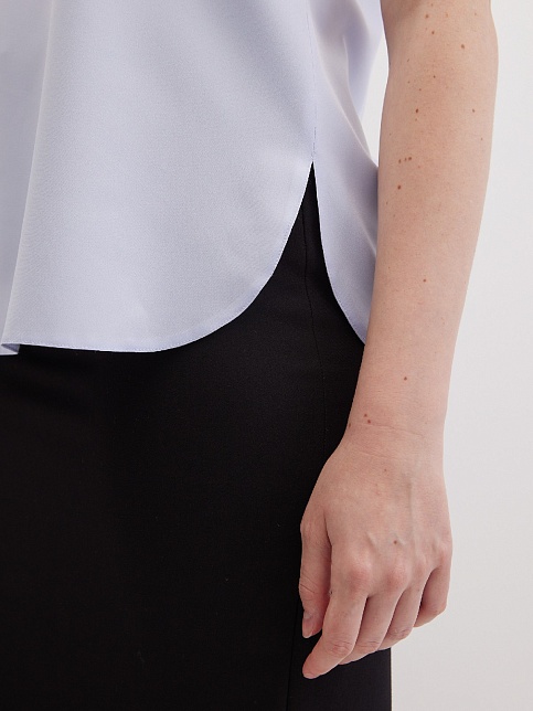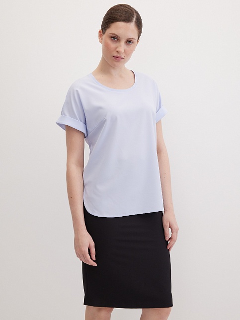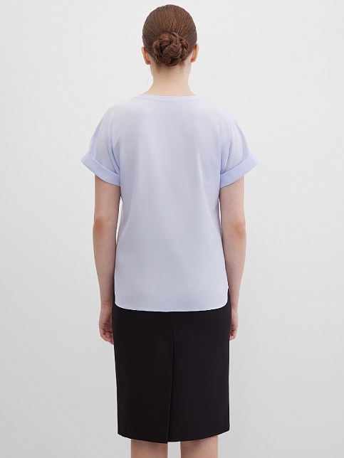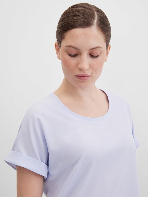 Легкая и свободная блуза из струящегося материала с содержанием вискозы цвета перванш - один из оттенков нежно-голубого с розовато-сиреневым оттенком. Элегантная модель средней длины, свободный крой дарит максимальную свободу движений и комфорт, цельнокроеный короткий рукав с отворотом, круглый вырез горловины обработан узким кантом и красиво смотрится при любой длине шеи, фигурный низ с аккуратными боковыми разрезами. Длина и умеренный объем позволяют носить ее навыпуск или заправленной.