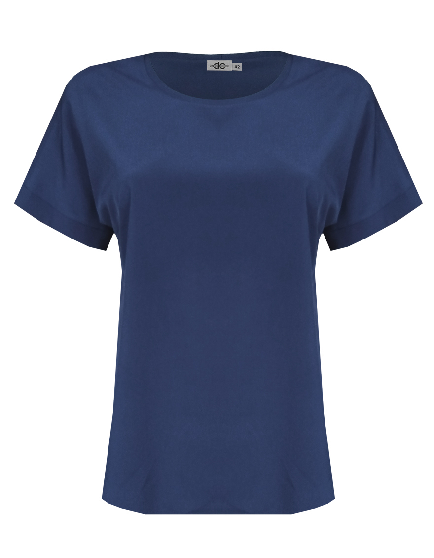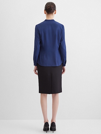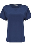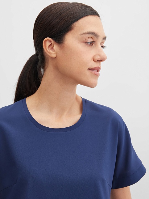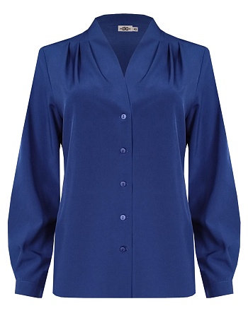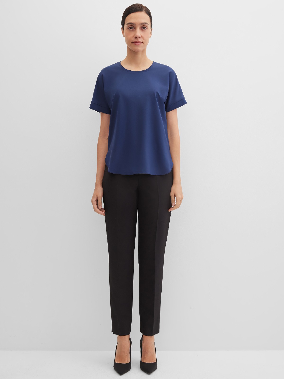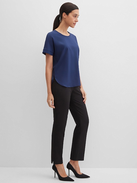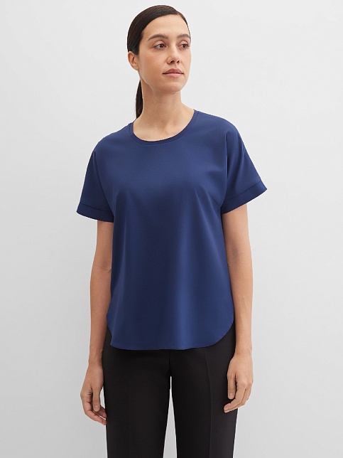 Легкая изящная блуза свободная блуза из тонкого и нежного материала с содержанием вискозы в классическом синем цвете. Элегантная модель средней длины, свободный крой дарит максимальную свободу движений и комфорт, цельнокроеный короткий рукав с манжетом, повторяющий нижнюю часть рукава, круглый вырез горловины обработан узким кантом и красиво смотрится при любой длине шеи, фигурный низ с аккуратными боковыми разрезами. Длина и умеренный объем позволяют носить ее навыпуск или заправленной.