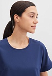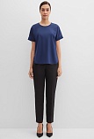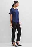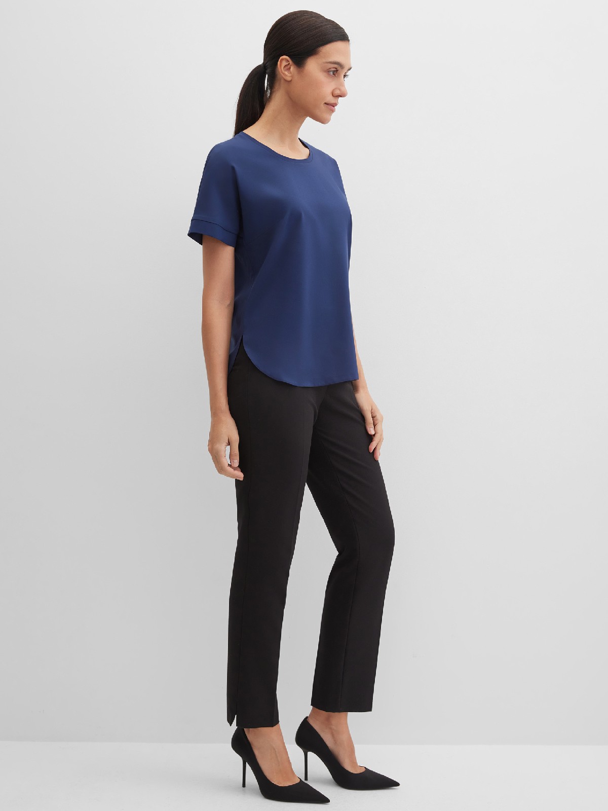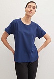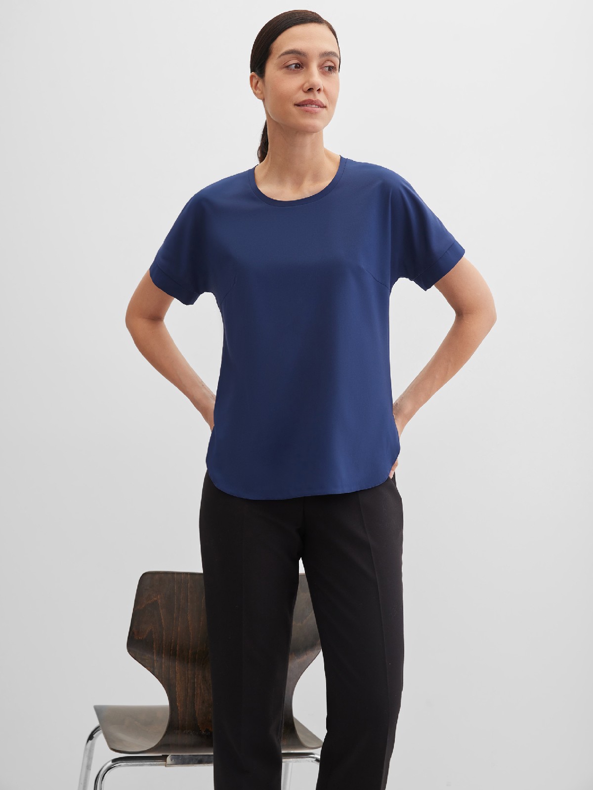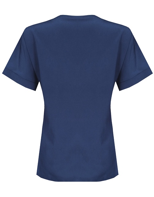 Легкая изящная блуза свободная блуза из тонкого и нежного материала с содержанием вискозы в классическом синем цвете. Элегантная модель средней длины, свободный крой дарит максимальную свободу движений и комфорт, цельнокроеный короткий рукав с манжетом, повторяющий нижнюю часть рукава, круглый вырез горловины обработан узким кантом и красиво смотрится при любой длине шеи, фигурный низ с аккуратными боковыми разрезами. Длина и умеренный объем позволяют носить ее навыпуск или заправленной.