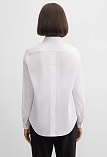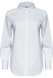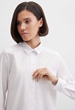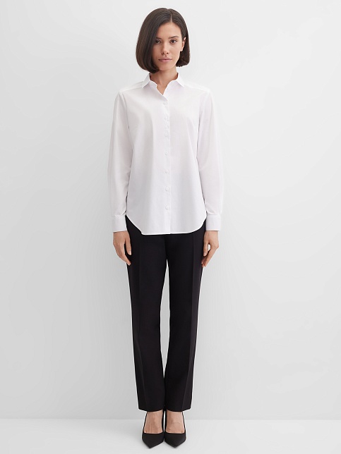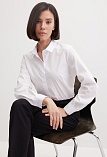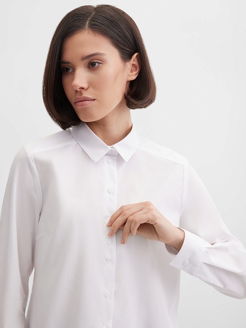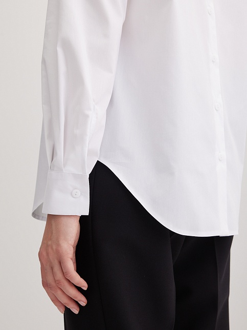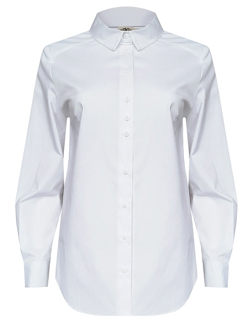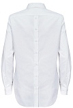 Блузка рубашка из белой сорочечной ткани высокого качества свободного силуэта, цельнокроеная кокетка исключает плечевой шов и позволяет добиться хорошей посадки в области плеч, отложной воротник на стойке, декоративный элемент по спинке в виде функциональной застежки на мелкие пуговицы украшает модель и формирует более свободной силуэт, по переду функциональная застежка на пуговицы, модель удлиненная с фигурным низом, длинный втачной рукав на манжете с функциональной петлей и пуговицей.