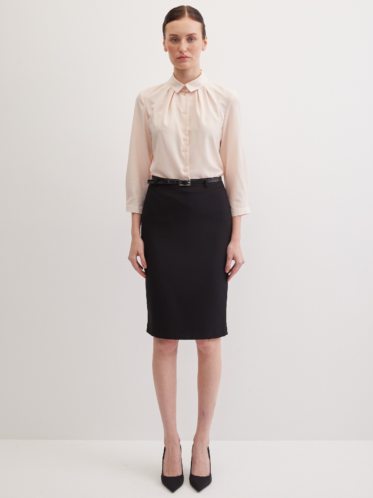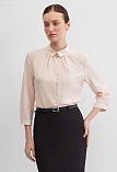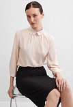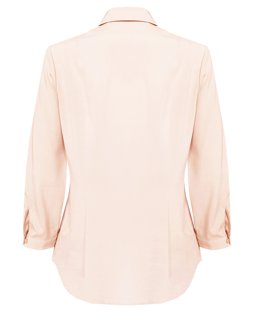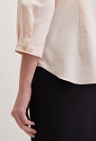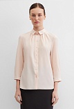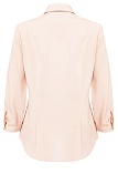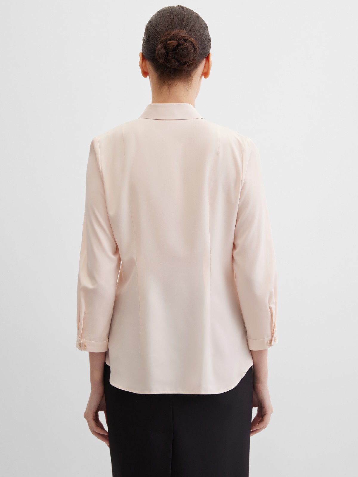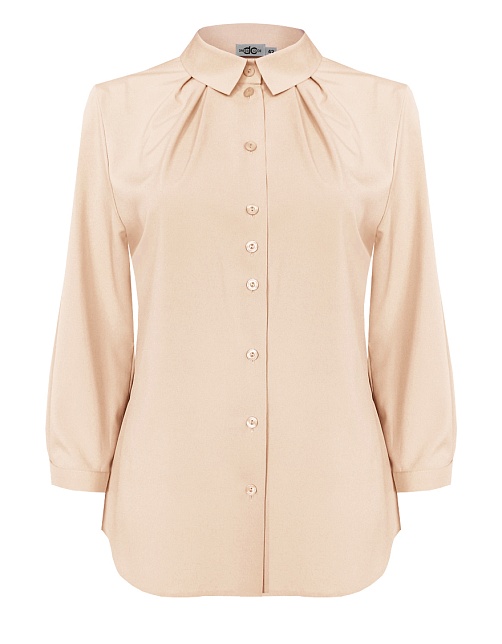 Изысканная утонченная блуза из струящейся вискозной ткани в приглушенном оттенке "чайная роза" - это нежный, пыльный бежевый цвет с легким ненавязчивым подтоном розового или персикового, придавая ему теплоту и мягкость. Модель приталенная, средняя длина, отложной рубашечный воротник, по горловине спереди заложены мягкие складки, застежка на мелкие пуговицы, втачной рукав с длиной 3/4 на манжете с функциональной петлей и пуговицей.