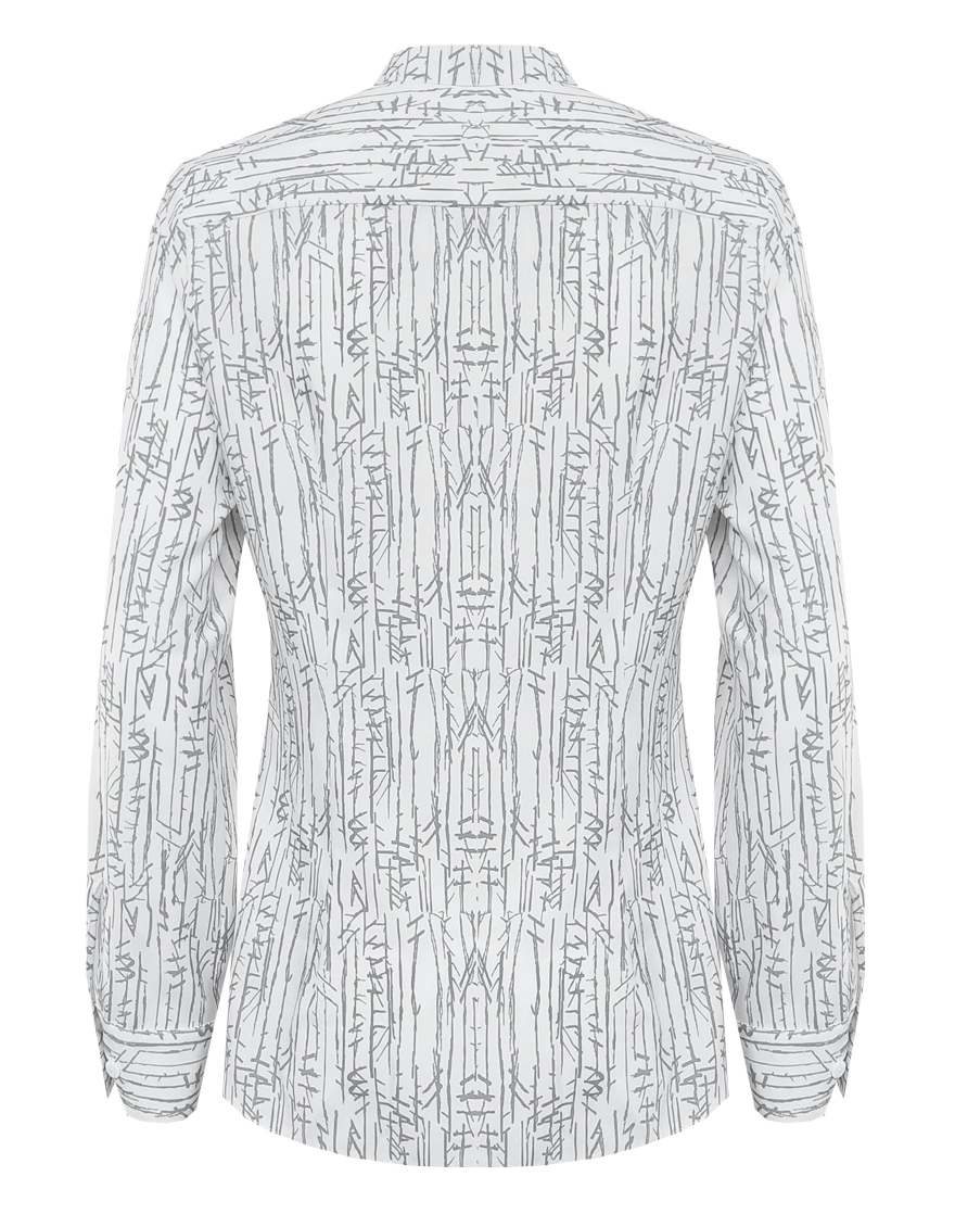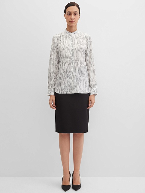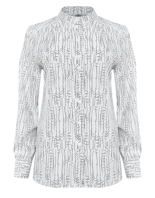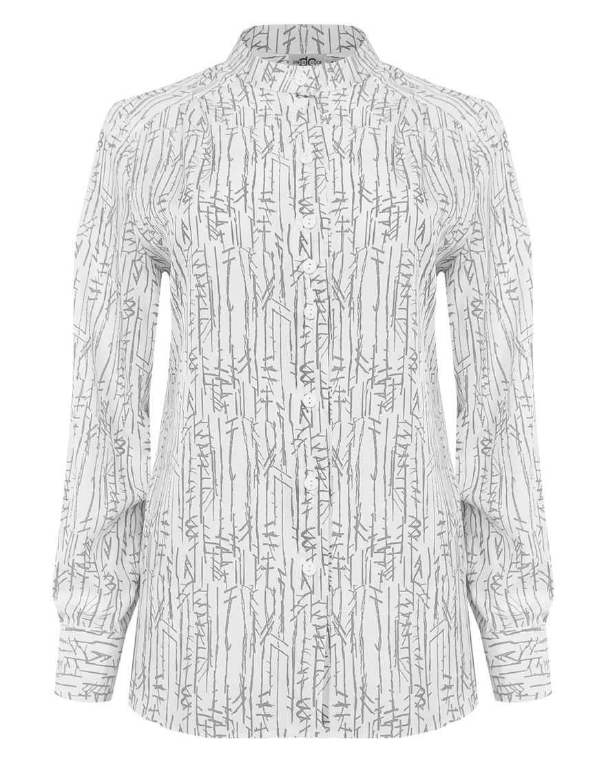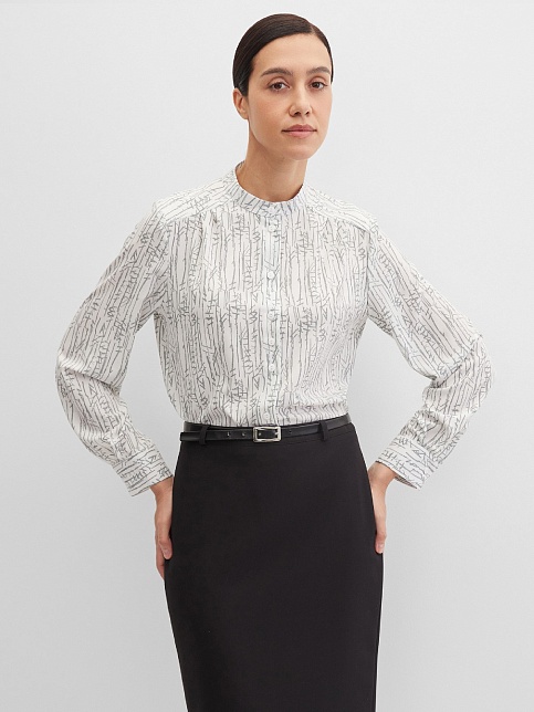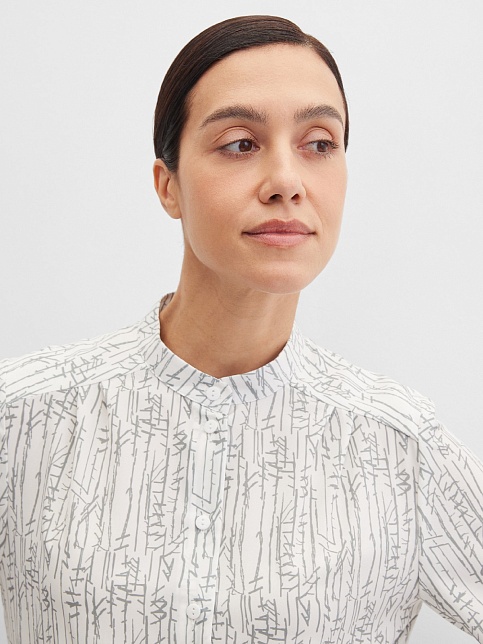 Изысканная блуза из шелковистого и струящегося материала с содержанием вискозных волокон, нейтральный молочный фон придает образу легкость и утонченность, а абстрактный принт в натуральных оттенках делает его идеальной базой для создания минималистичных, но впечатляющих ансамблей, средняя длина, приталенная, небольшой воротник стойка, по цельнокроеной кокетке спереди заложены мягкие складки, застежка на пуговицы, длинный втачной рукав на манжете с функциональной петлей и пуговицей.