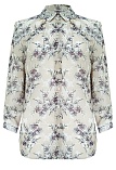 Блуза из воздушного вискозного шифона с цветочным принтом в гармоничном и элегантном сочетании теплых нейтральных оттенков с более насыщенными и глубокими цветами, приталенная, средняя длина, отложной рубашечный воротник, по горловине спереди заложены мягкие складки, застежка на мелкие пуговицы, втачной рукав с длиной 3/4 на манжете с функциональной петлей и пуговицей.
