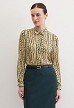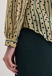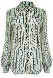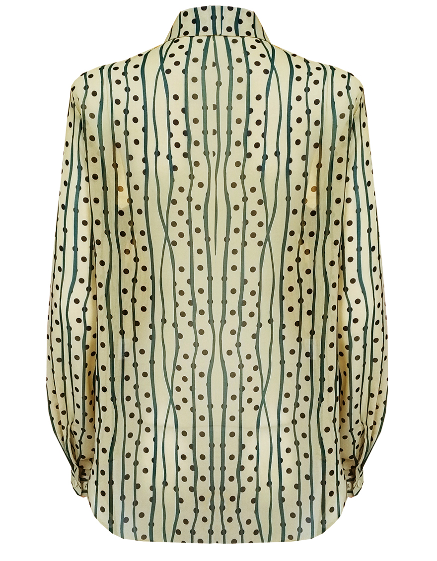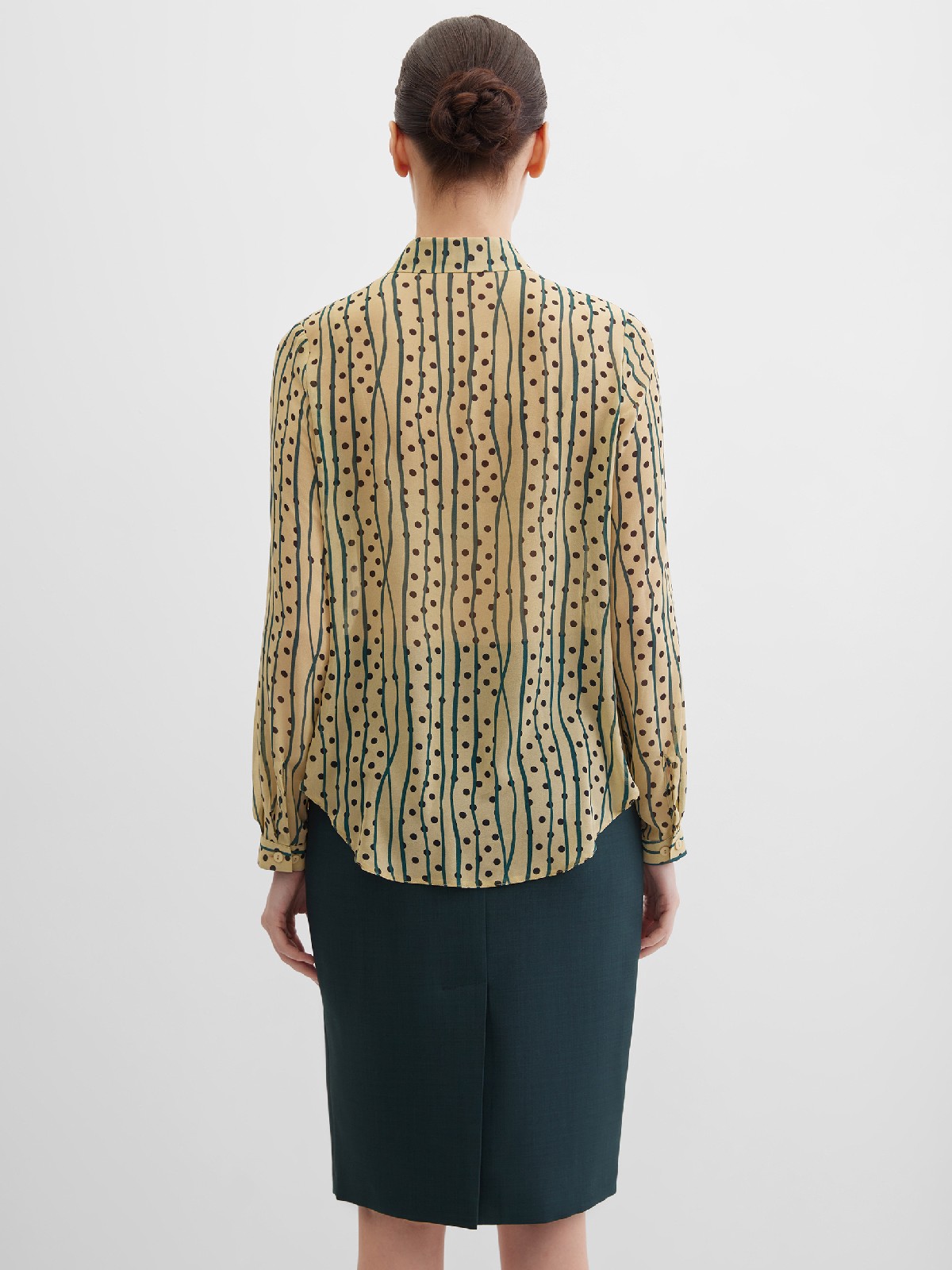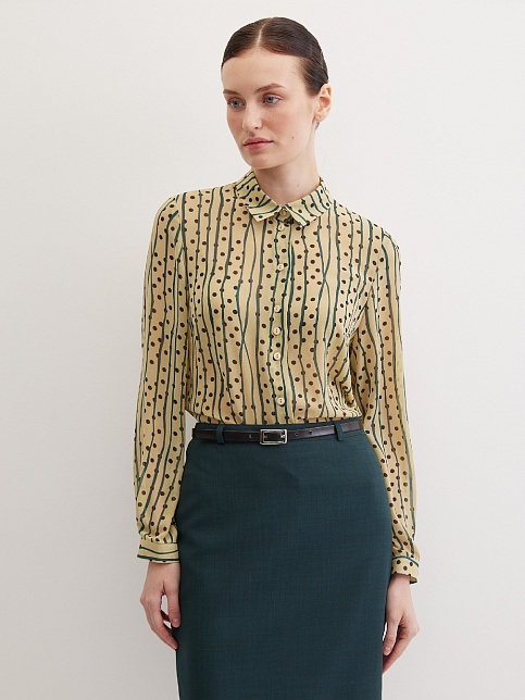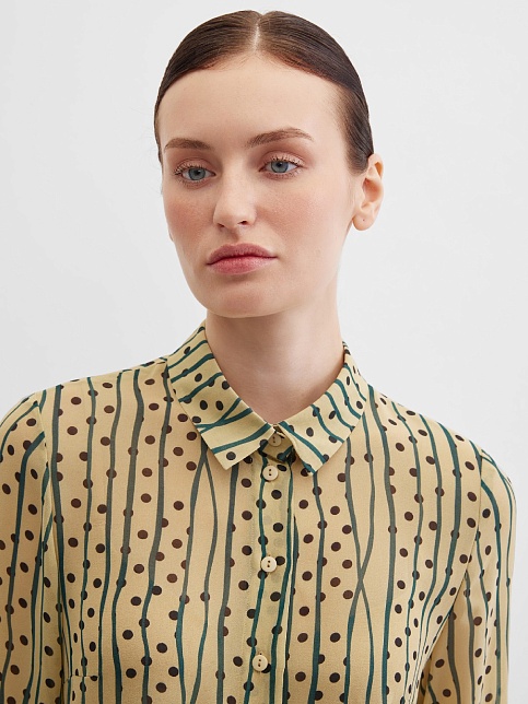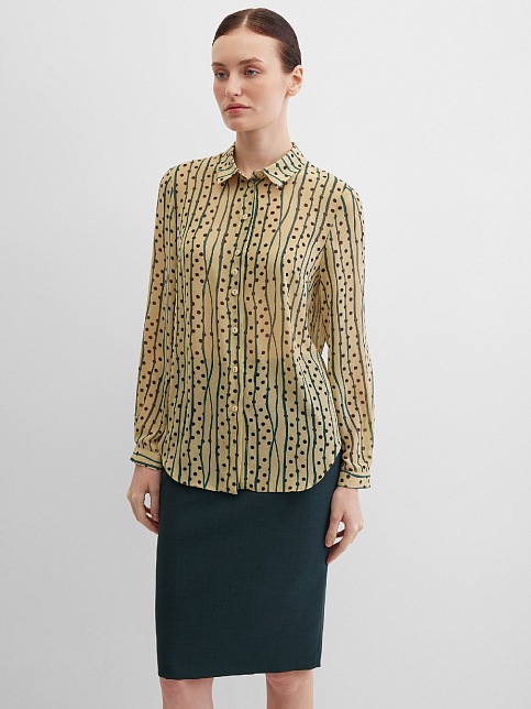 Многоцветная блуза из дышащей и воздушной шифоновой ткани создает ощущение легкости и свободы, приятна к телу, тактильно комфортна, скроена по типу классической рубашки, отсутствие вытачек по талии делает блузу более свободной, что обеспечивает хорошую посадку и комфорт, средняя длина, отложной рубашечный воротник, застежка на мелкие пуговицы, длинный втачной рукав  на манжете с функциональной петлей и пуговицей.