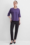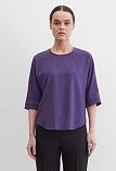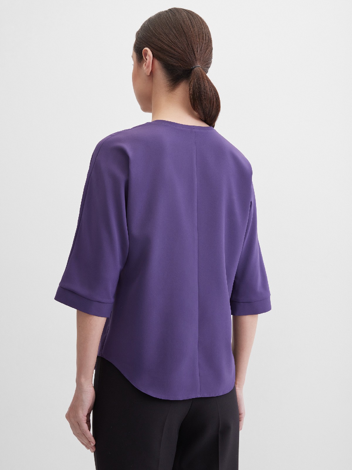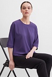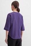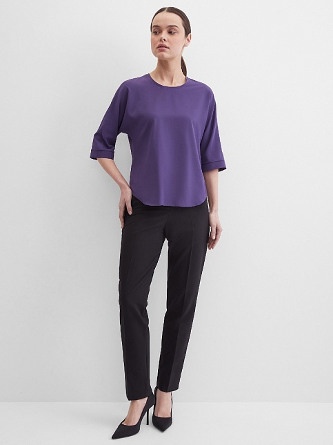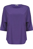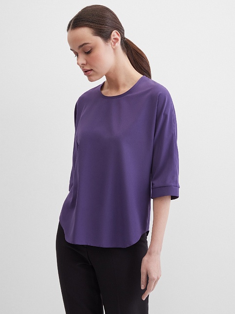 Универсальная блуза в благородном приглушенном фиолетовом цвете из легкой вискозной ткани с цельнокроеными рукавами "летучая мышь" умеренного объема, благодаря свободе и мягким линиям силуэта, такая блуза выгодно смотрится на женщинах любой комплекции, средняя длина, круглый вырез горловины обработан косой бейкой в цвет ткани, без застежки на пуговицы, рукава 3/4, фигурный низ позволяет создать более оригинальные и модные образы.