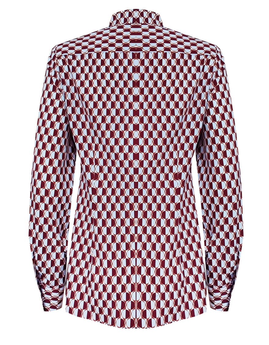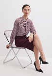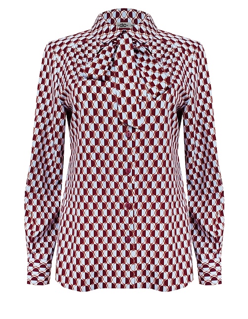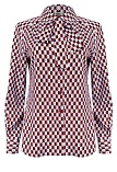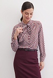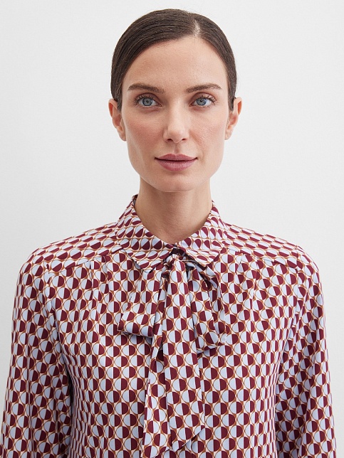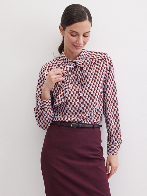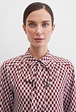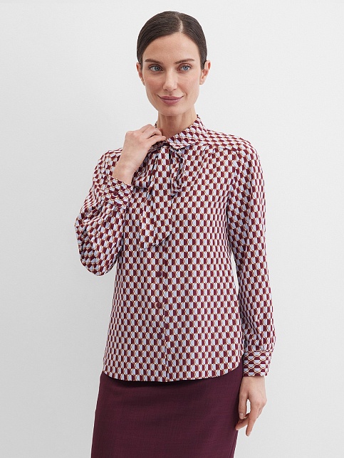 Яркая и стильная блуза с мозаичным принтом, где рисунок имитирует мозаику и состоит из множества мелких разноцветных элементов. Модель приталенная, средняя длина, рубашечный воротник, застежка на пуговицы, длинный втачной рукав на манжете с пуговицей. Акцент модели - "галстук-бант" на шее, концы которого могут завязываться разными способами, а при желании его можно снять, придав модели ненавязчивую строгость.