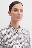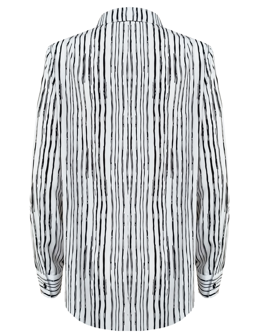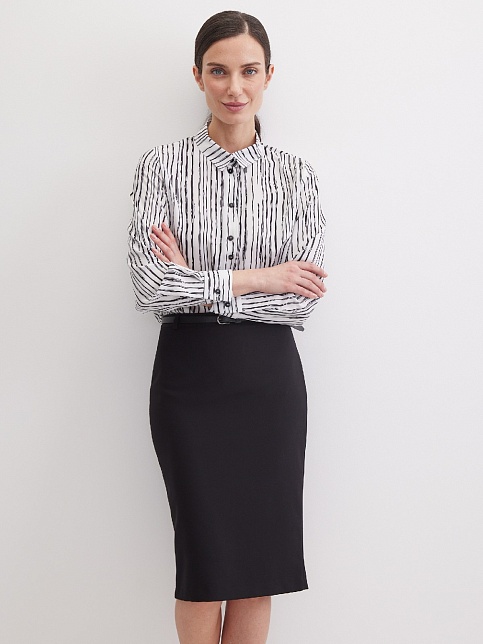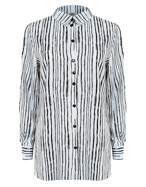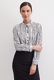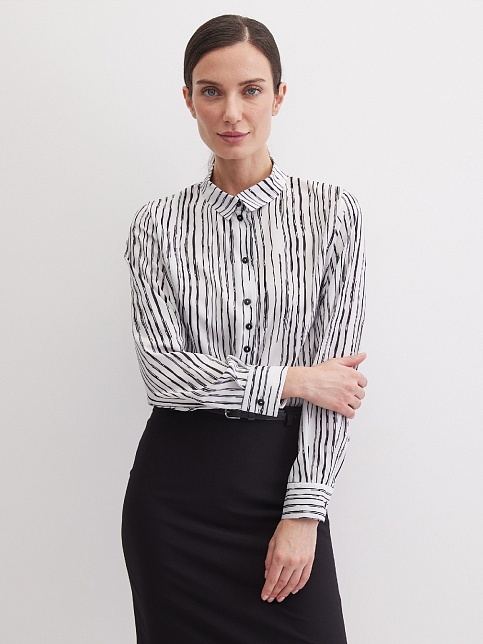 Вискозная блуза в "стиле black and white" - универсальное сочетание черного и белого цветов для строгого и делового образа, скроена по типу классической рубашки, приталенность придает женственности и смягчает образ, средняя длина, отложной рубашечный воротник, застежка на мелкие пуговицы, длинный втачной рукав  на манжете с функциональной петлей и пуговицей.