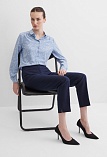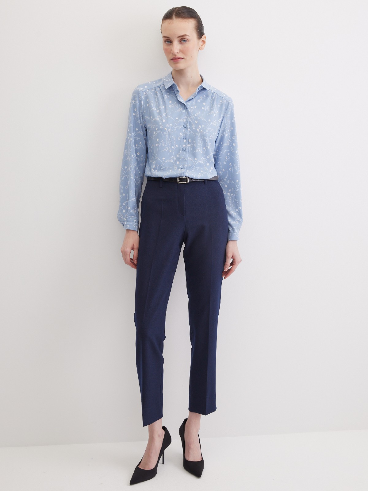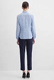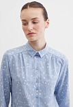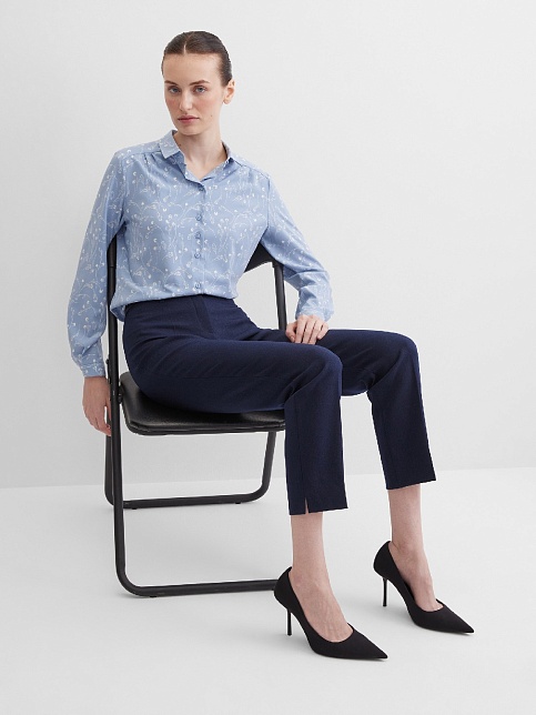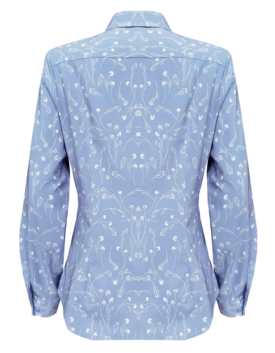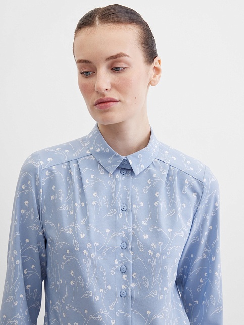Блузка из струящейся поливискозной ткани в природном оттенке серо-голубого цвета в сочетании с эффектным белоснежным рисунком, средняя длина, приталенный силуэт, рубашечный воротник, цельнокроеная кокетка по спинке и полочке исключает плечевой шов и позволяет добиться хорошей посадки в области плеч, от кокетки спереди заложены мягкие складки умеренного объема, застежка на мелкие пуговицы, длинный втачной рукав на манжете с функциональной петлей и пуговицей.