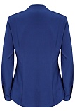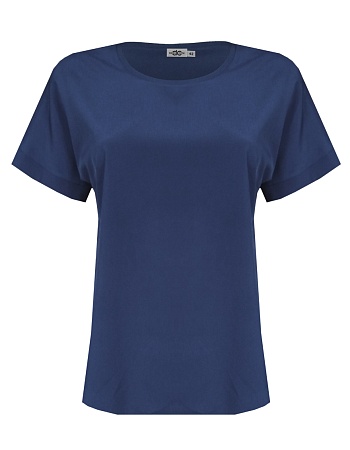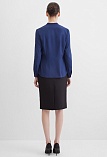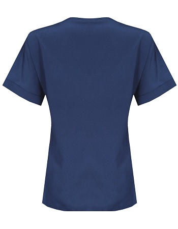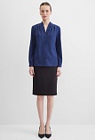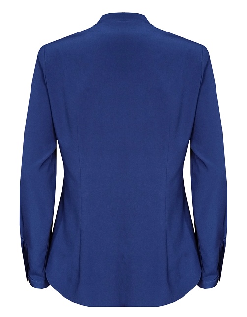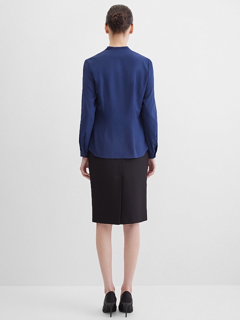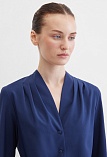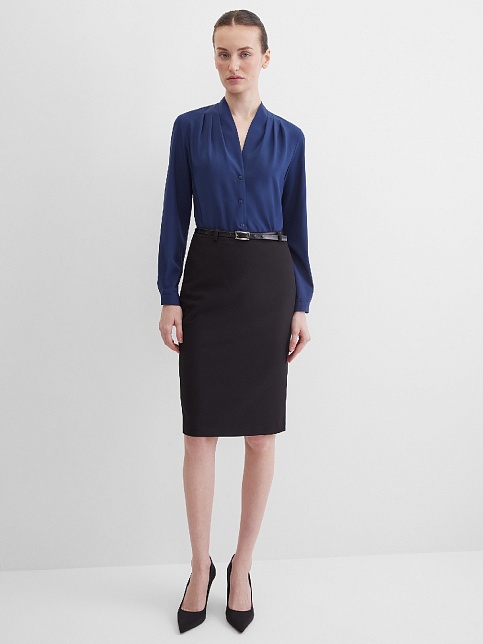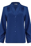 Повседневная практичная блуза из мягкой и струящейся вискозной ткани в классическом темно-синем цвете, средняя длина, ткань приятная на ощупь и проста в уходе, приталенный силуэт, V-образная горловина с цельнокроеным воротником и застроченными складками от плеча, застежка на мелкие пуговицы в цвет ткани, длинный втачной рукав на манжете с функциональной петлей и пуговицей.