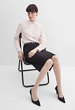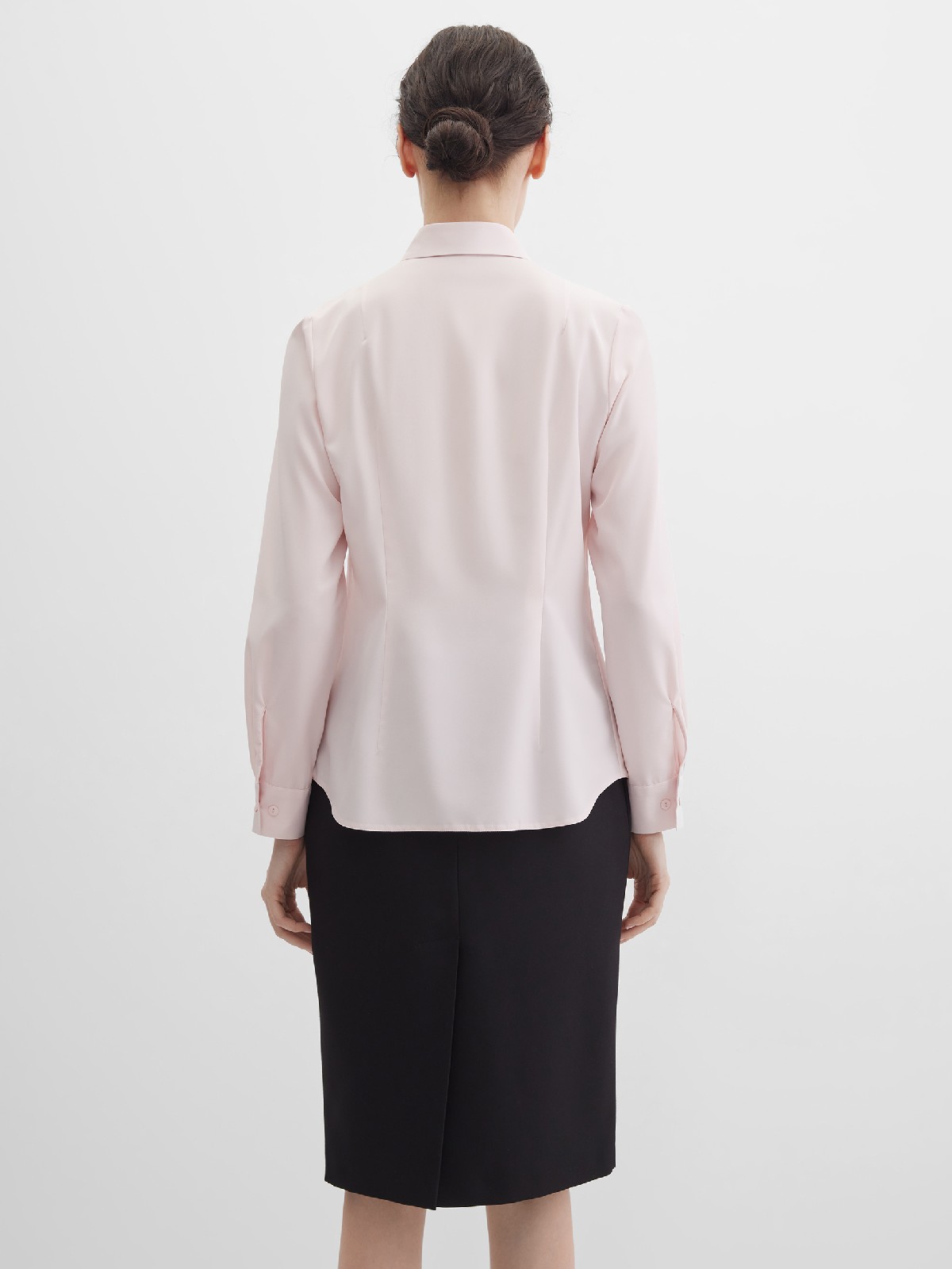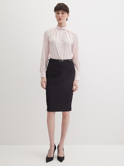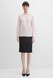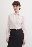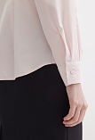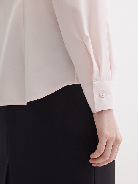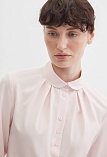 Нежная блуза из струящейся поливискозной ткани в мягком, приглушенном оттенке розового, напоминающий нежные лепестки цветов и воплощающий нежную успокаивающую эстетику, средняя длина, приталенная, по горловине заложены мягкие складки, круглый отложной воротник на стойке, застежка на пуговицы, длинный втачной рукав на  манжете с функциональной петлей и пуговицей.