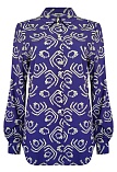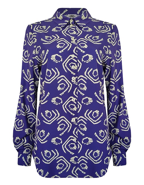 Блуза с ярко-желтым принтом на фиолетовом фоне - это динамичное и контрастное сочетание цветов, которое создает яркий и запоминающийся визуальный эффект, такое сочетание моментально приковывает взгляд и используется для создания смелых и ярких образов, скроена по типу классической рубашки, приталенная, средняя длина, отложной рубашечный воротник, застежка на мелкие пуговицы, длинный втачной рукав  на манжете с функциональной петлей и пуговицей.