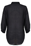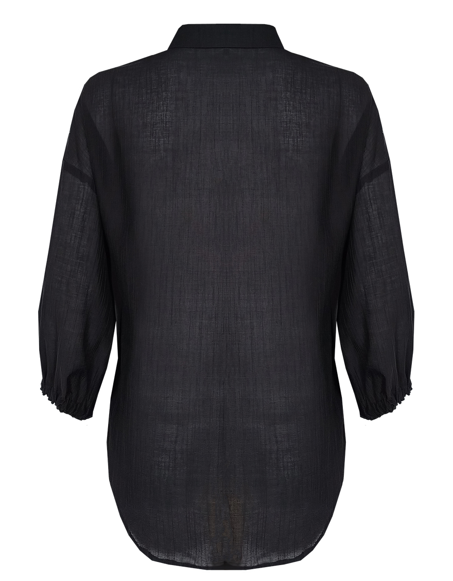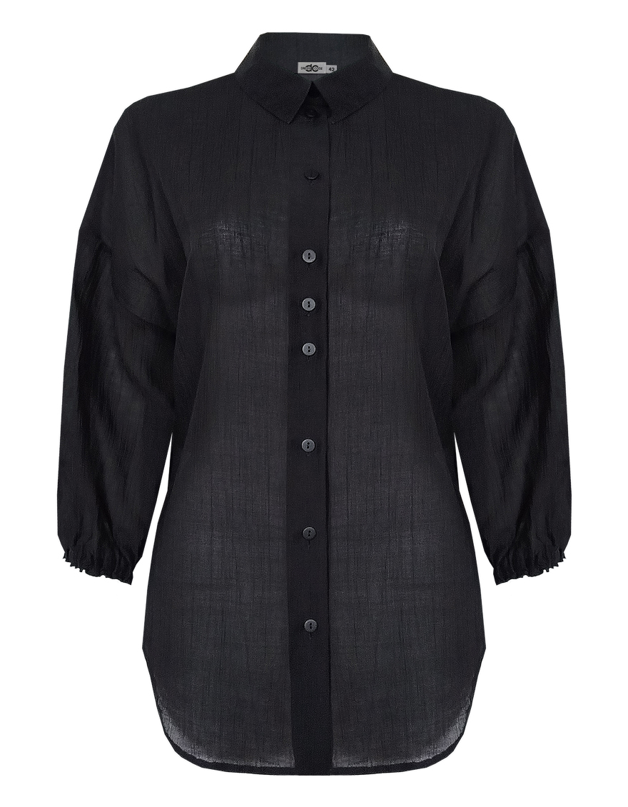Комфортная блуза в базовом черном цвете из фактурной ткани "жатка" с характерной легкой "помятостью", спущенная линия плеча выглядит мягче и уютнее, особый крой без вытачек придает изделию свободный и расслабленный вид, отложной воротник, удлиненная с фигурным низом, застежка на пуговицы, рукав 3/4 собран на резинку. Модель актуальна для женщин любого размера и телосложения, даже если фигура далека от идеала. Уход не требует особых усилий и является удобным вариантом для повседневной носки.
