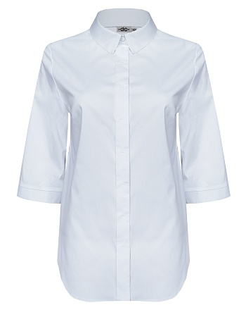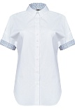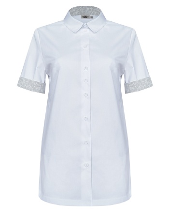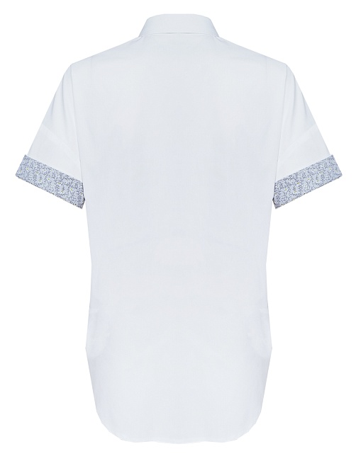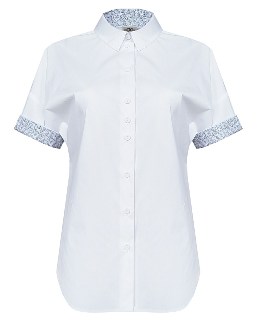 Блузка рубашка из невесомой сорочечной ткани в базовом белом цвете с модным акцентом на детали из ткани-компаньона с нежным цветочным принтом (внутренняя часть стойки воротника и отвороты на рукавах), идеальная посадка, спущенная или удлиненная линия плеча выглядит мягче и уютнее, а особый крой без вытачек придает изделию свободный и расслабленный вид, отложной воротник на стойке, средняя длина с фигурным низом, застежка на пуговицы, короткий рукав с отворотом.
