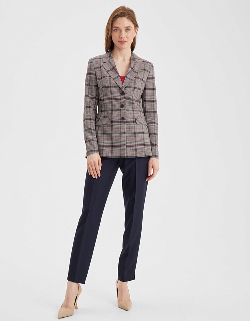 Зауженные книзу брюки в классическом темно-синем цвете на поясе, посадка средняя, сзади два внутренних кармана, застежка на молнию и пуговицу спереди, заутюженные стрелки, небольшие боковые разрезы внизу.