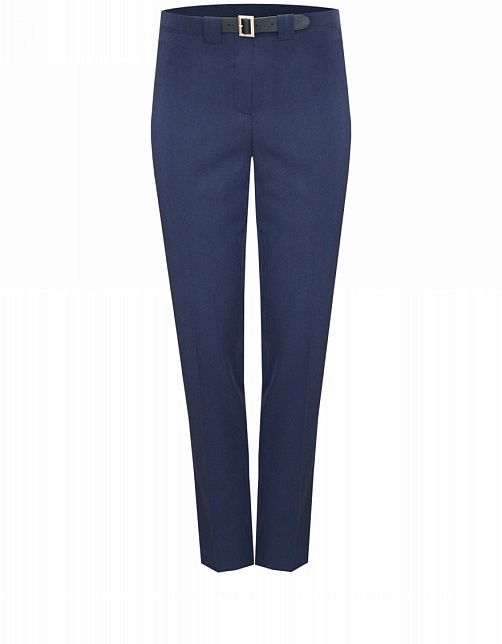 Темно-синие брюки из поливискозной ткани зауженные книзу, с кулиской и декоративным ремнем по талии, посадка средняя, застежка на молнию спереди, сзади декоративный карман, заутюженные стрелки, внизу небольшие боковые разрезы. Поливискозная ткань - смесовая ткань, в состав которой входят волокна вискозы и полиэстера. Именно полиэстер придает ткани прочность, долговечность и опрятный внешний вид.