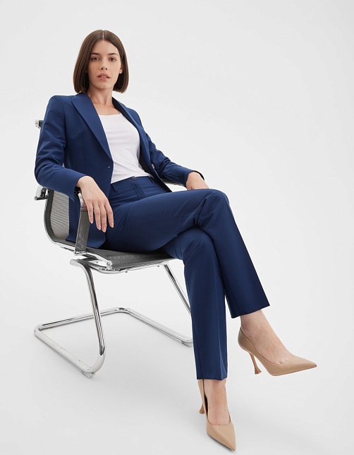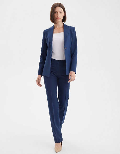 Брюки прямого кроя в красивом синем цвете из костюмной поливискозной ткани, без пояса, с талиевыми вытачками и шлевками под ремень, посадка средняя, застежка на молнию и пуговицу спереди, заутюженные стрелки, низ обработан от осыпания ткани, но не подогнут - это позволяет скорректировать длину брюк под свой рост.