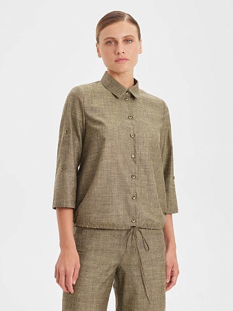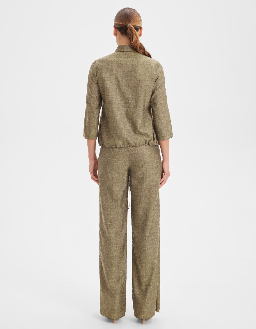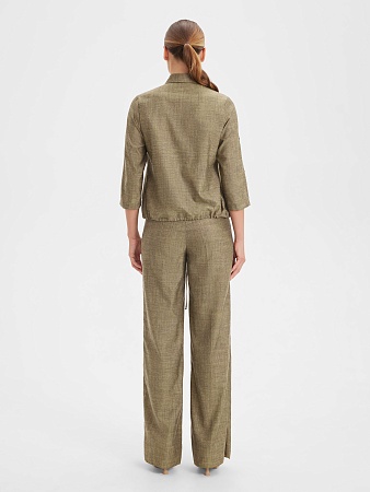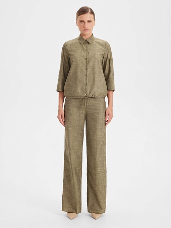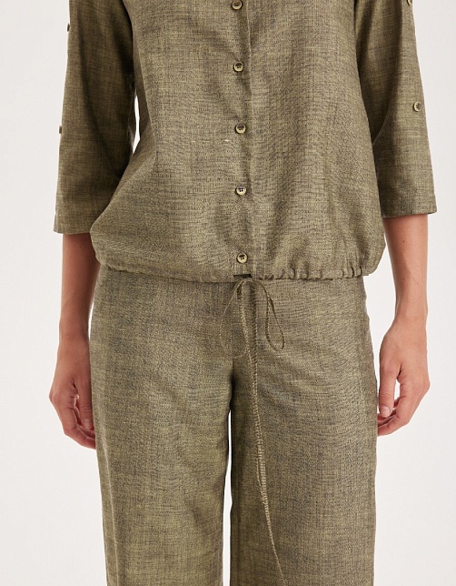 Легкие брюки свободного кроя из смесовой ткани оттенка золотистой охры с легким меланжевым эффектом, на резинке, шлевки под ремень, посадка средняя, имитация гульфика заменяет застежку на молнию и пуговицу, боковые карманы с отрезным бочком, заутюженные стрелки, низ обработан от осыпания ткани, но не подогнут - это позволяет скорректировать длину брюк под свой рост, без подкладки. Ткань сохраняет свою натуральность, меньше мнется, ее легче гладить, в отличие от чистольняной ткани.