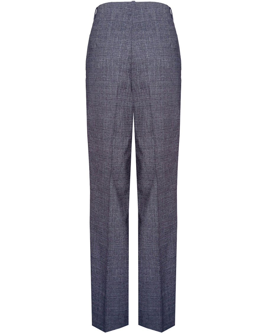 Брюки свободные из антрацитового меланжа: основной оттенок серо-черный, в который вплетается более светлая нить, придавая ткани двухцветный цветовой эффект, а вплетение третьего цвета образует "легкий намек на клетку". Средняя  посадка, на внутренней обтачке и шлевками под ремень, застежка на молнию и пуговицу спереди, умеренный объем в области бедер за счет складок по переду, заутюженные стрелки, низ обработан от осыпания ткани, но не подогнут, что позволяет скорректировать длину под свой рост