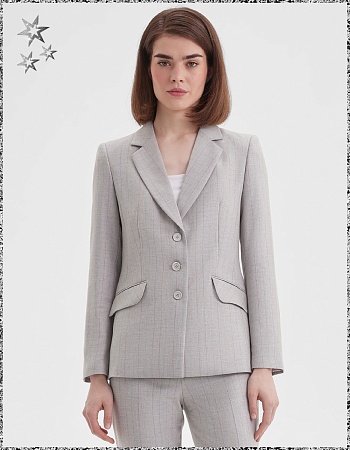 Классические брюки прямого кроя с двухцветным цветовым эффектом из поливискозной ткани светло-серого цвета с вплетением разноцветных нитей, создавая эффект тонкой полоски. Модель без пояса, с талиевыми вытачками и шлевками под ремень, посадка средняя, застежка на молнию и пуговицу спереди, заутюженные стрелки, низ обработан от осыпания ткани, но не подогнут - это позволяет скорректировать длину брюк под свой рост, без подкладки и карманов.