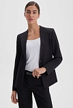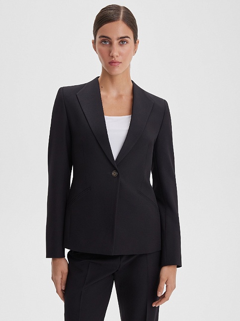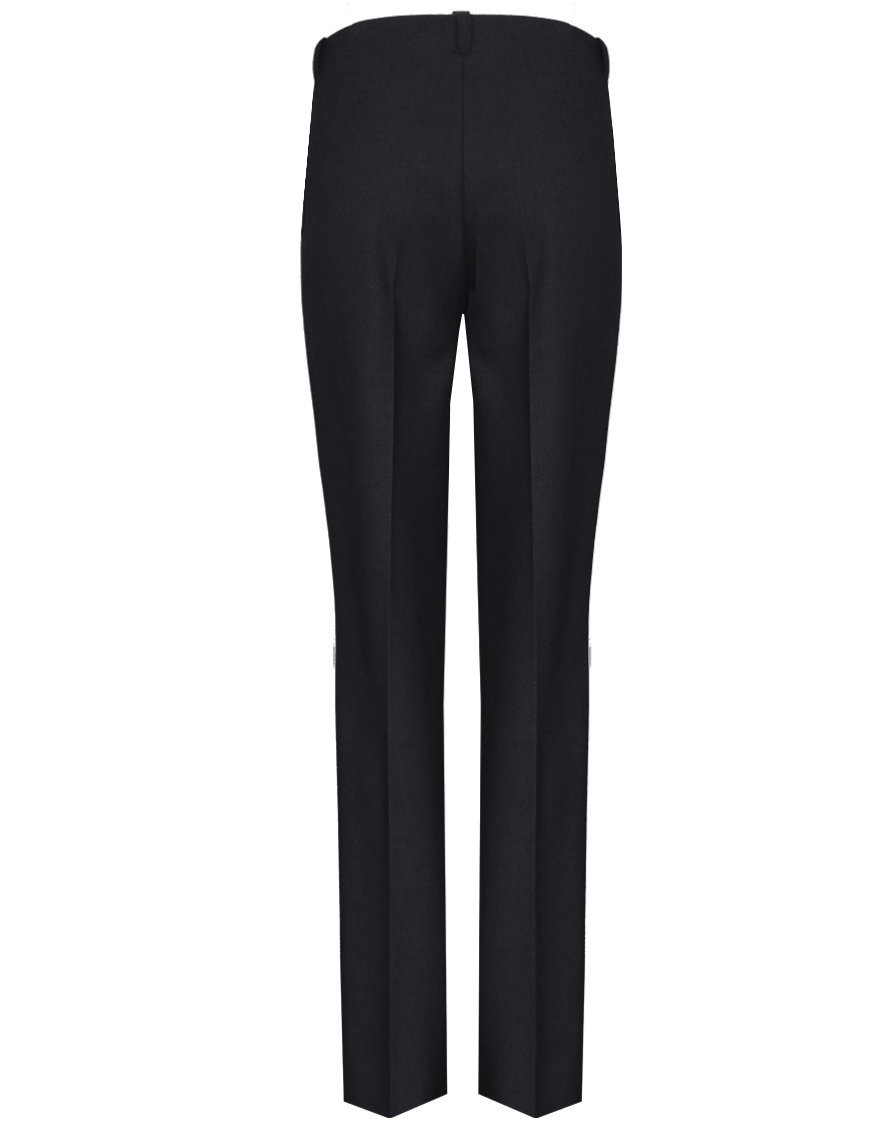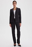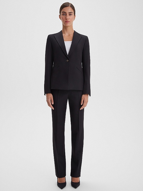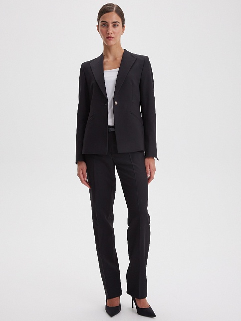 Классические черные брюки прямого кроя из поливискозной ткани, без пояса, с талиевыми вытачками и шлевками под ремень, посадка средняя, застежка на молнию и пуговицу спереди, заутюженные стрелки, низ обработан от осыпания ткани, но не подогнут - это позволяет скорректировать длину брюк под свой рост, без подкладки и карманов. Резинка на поясе обеспечивает комфортную посадку, не передавливает тело и позволяет свободно двигаться.