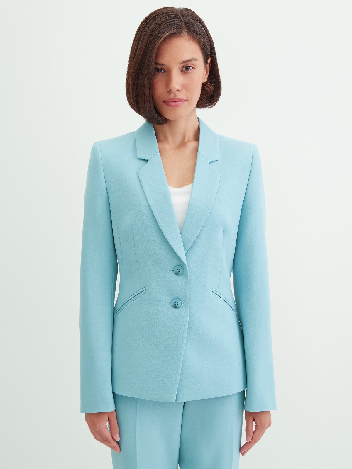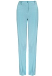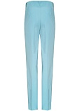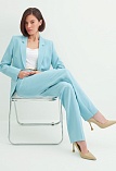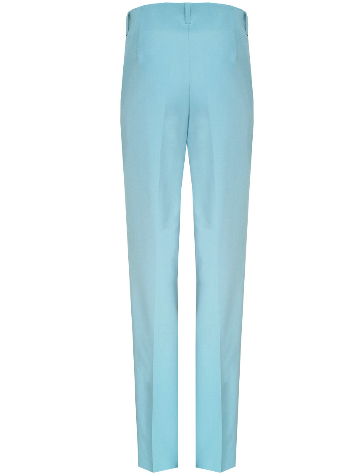Классические брюки прямого кроя из поливискозной ткани в пастельно-бирюзовом цвете выглядят нежно и освежающе, модель без пояса, с талиевыми вытачками и шлевками под ремень, посадка средняя, застежка на молнию и пуговицу спереди, заутюженные стрелки, низ обработан от осыпания ткани, но не подогнут - это позволяет скорректировать длину брюк под свой рост, без подкладки и карманов. Поливискозная ткань - это смесовая ткань, в состав которой входят волокна вискозы и полиэстера.