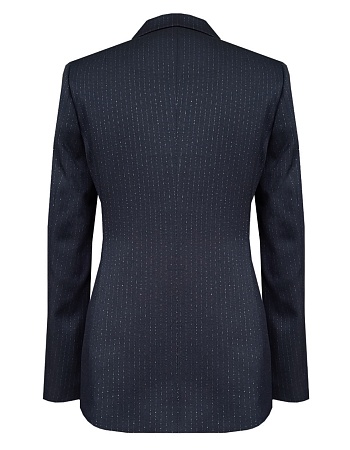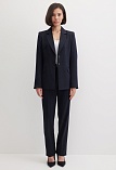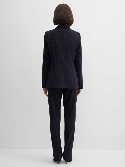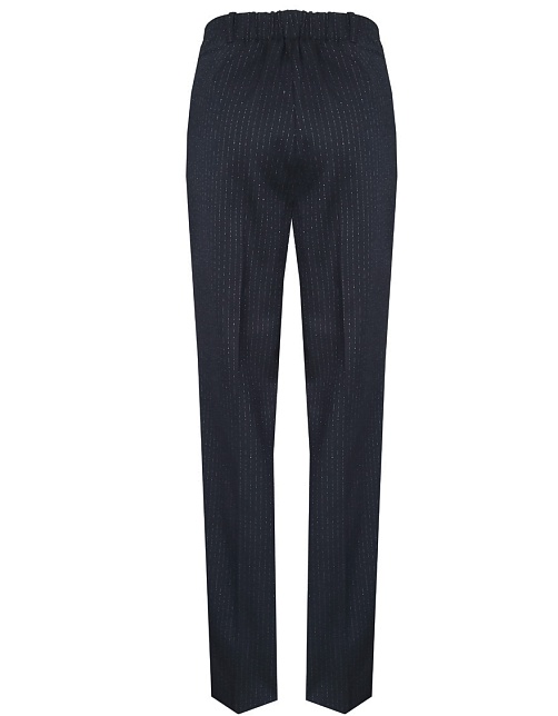 Классические брюки прямого кроя из поливискозной ткани темно-синего цвета в мерцающую серебристую полоску с утонченным блеском, удобная резинка в поясе брюк по талии сзади обеспечивает удобство и комфорт, не стесняя и не вызывая дискомфорта, шлевки под ремень, посадка средняя, застежка на молнию и пуговицу спереди, заутюженные стрелки, низ обработан от осыпания ткани, но не подогнут - это позволяет скорректировать длину брюк под свой рост, без подкладки и карманов.