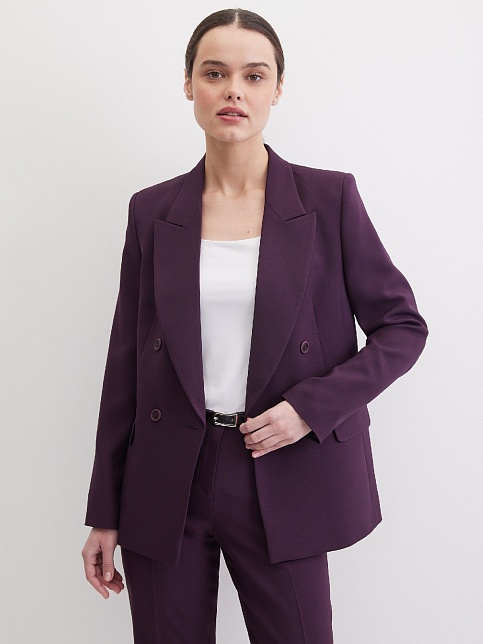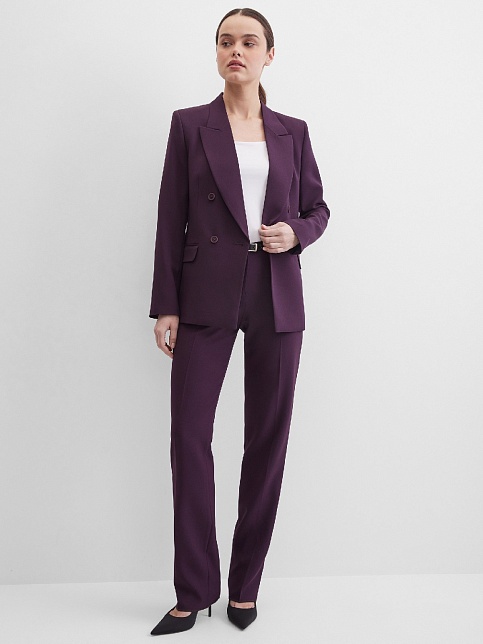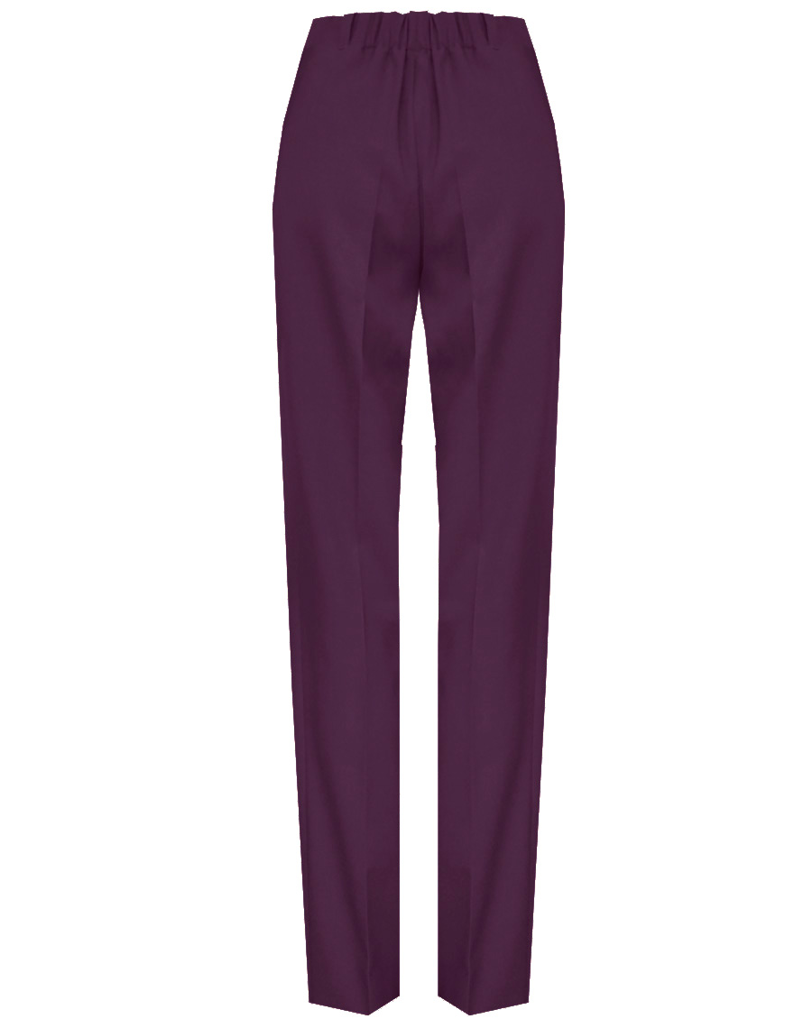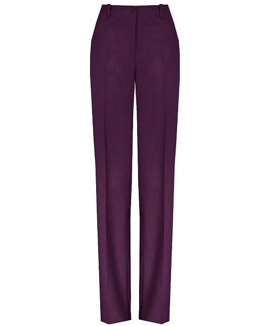 Классические брюки прямого кроя из поливискозной ткани в роскошном баклажановом цвете, удобная резинка по талии обеспечивает свободу движений и комфорт, помогает скрыть некоторые недостатки фигуры и сгладить ее, без пояса, на внутренней обтачке, шлевки под ремень, посадка средняя, застежка на молнию и пуговицу спереди, заутюженные стрелки, низ обработан от осыпания ткани, но не подогнут - это позволяет скорректировать длину брюк под свой рост, без подкладки и карманов.