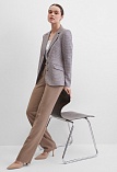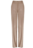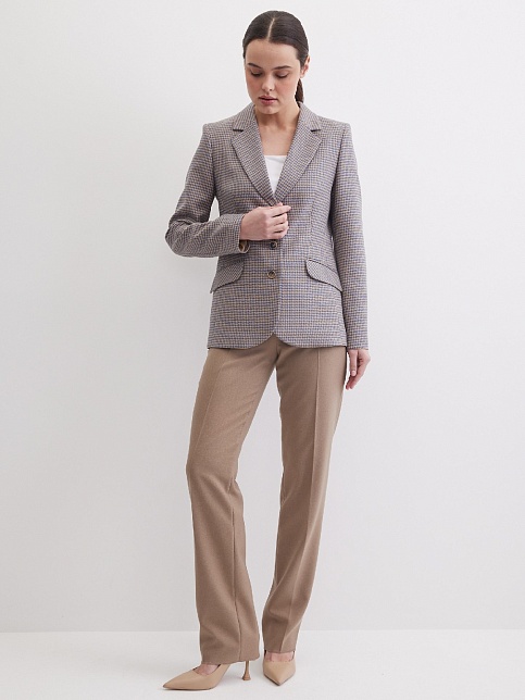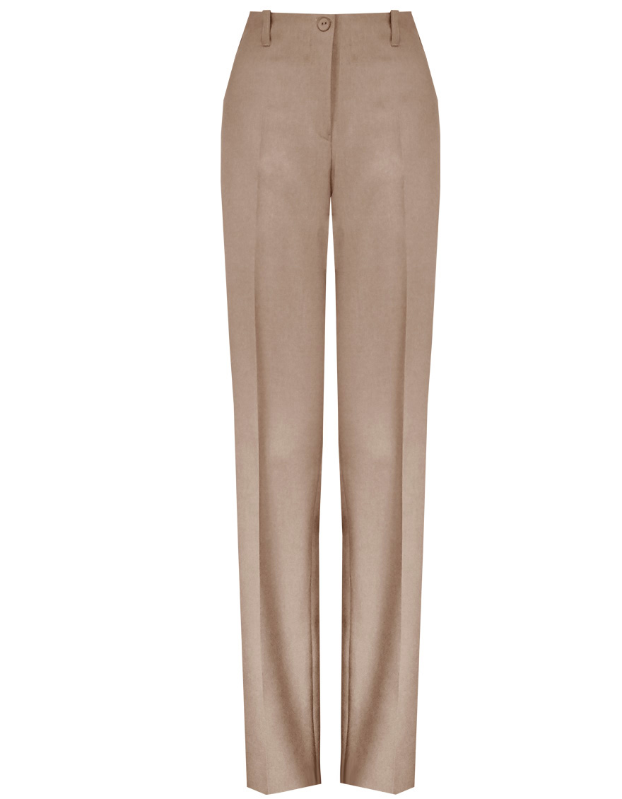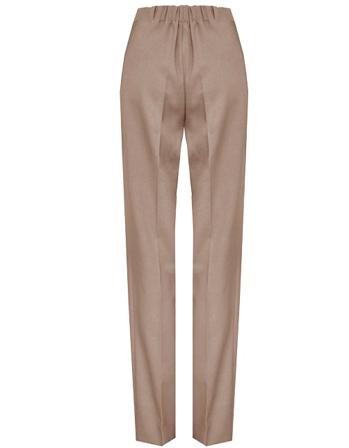 Классические брюки прямого кроя из поливискозной ткани в спокойном  бежевом оттенке для повседневного образа, удобная резинка по талии сзади  обеспечивает удобство и комфорт, не стесняя и не вызывая дискомфорта, шлевки под ремень, посадка средняя, застежка на молнию и пуговицу спереди, заутюженные стрелки, низ обработан от осыпания ткани, но не подогнут - это позволяет скорректировать длину брюк под свой рост, без подкладки и карманов.