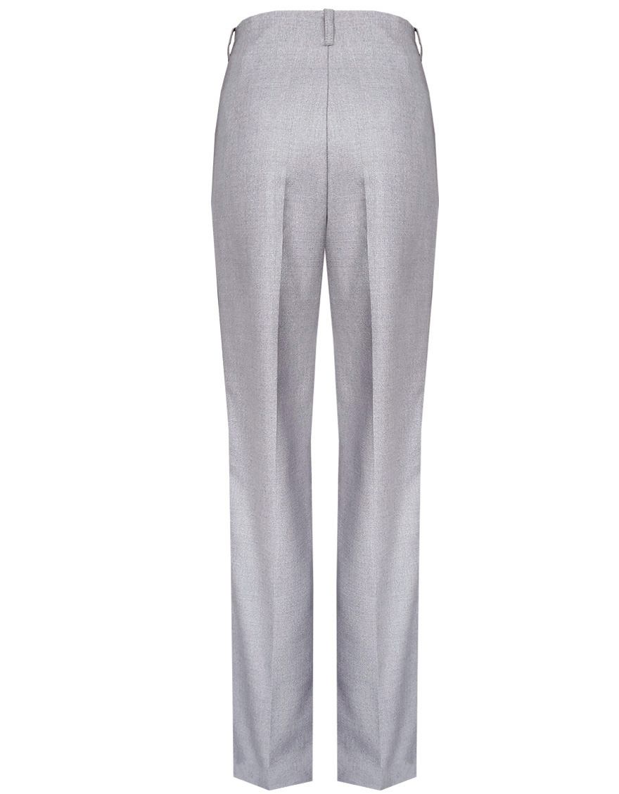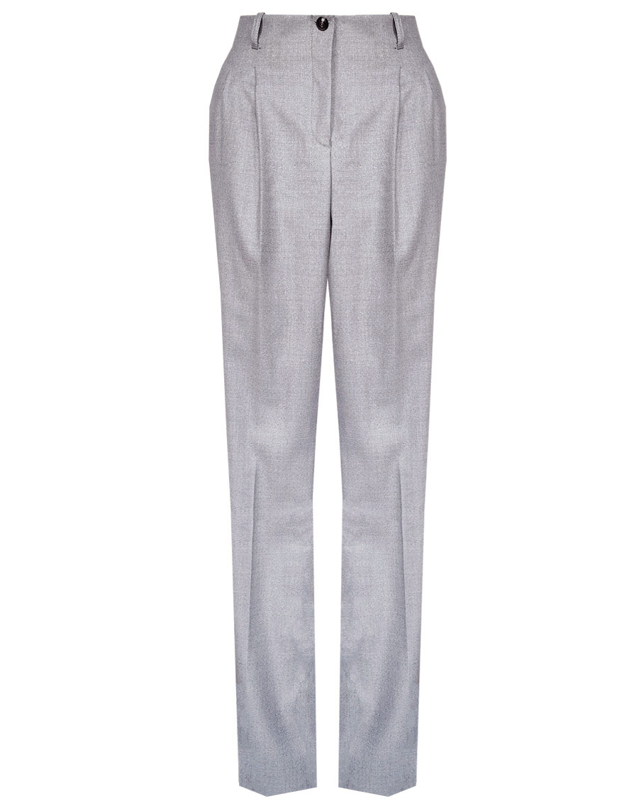 Классические брюки прямого кроя из поливискозной ткани серого цвета, модель без пояса, на внутренней обтачке и шлевками под ремень, небольшая складка по переду добавляет объем и комфорт, посадка средняя, застежка на молнию и пуговицу спереди, заутюженные стрелки, низ обработан от осыпания ткани, но не подогнут - это позволяет скорректировать длину брюк под свой рост, без подкладки и карманов. Поливискозная ткань - это смесовая ткань, в состав которой входят волокна вискозы и полиэстера.