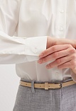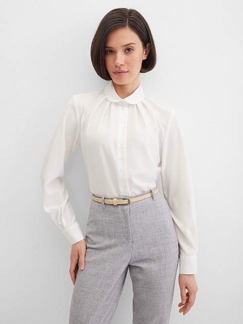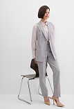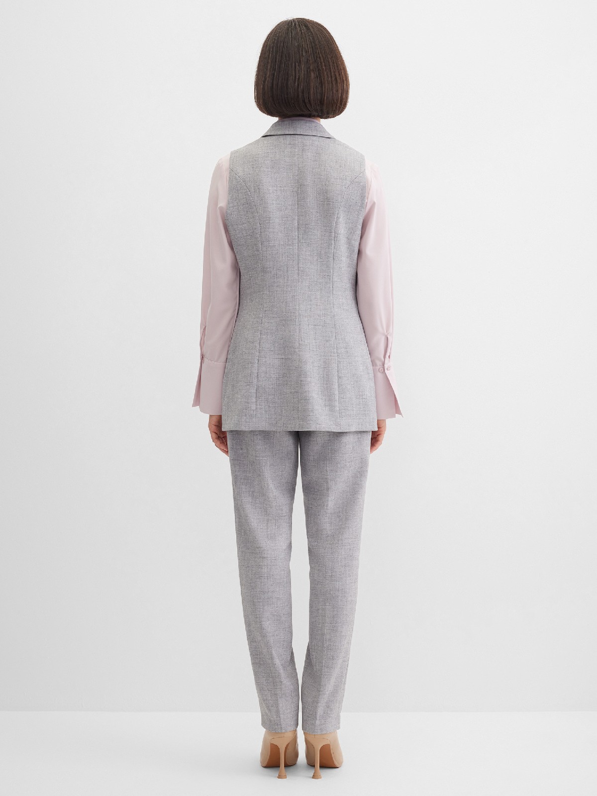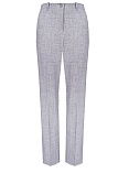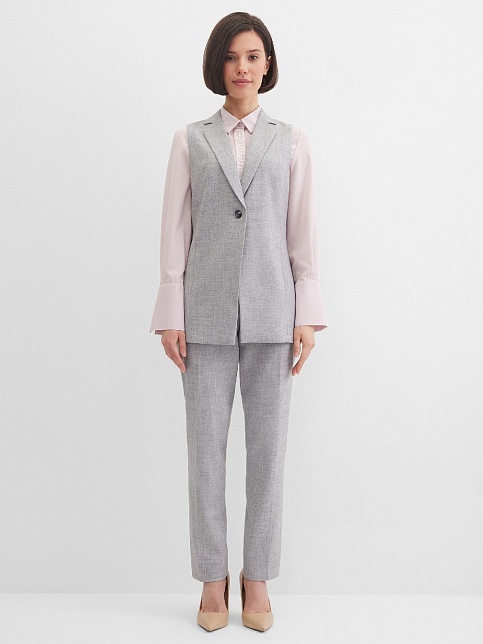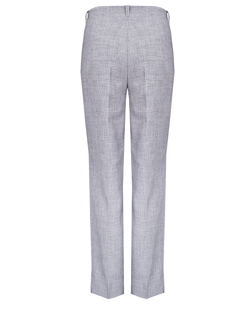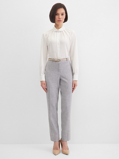 Классические базовые брюки слегка зауженные книзу из поливискозной ткани в мягком и нейтральном оттенке серого с легким меланжевым эффектом, средняя посадка, без пояса, на внутренней обтачке, шлевки под ремень, застежка на молнию и пуговицу спереди, без карманов и подкладки, заутюженные стрелки, небольшие боковые разрезы внизу. Поливискозная ткань - смесовая ткань, в состав которой входят волокна вискозы и полиэстера, именно полиэстер придает ткани прочность, долговечность и опрятный вид.