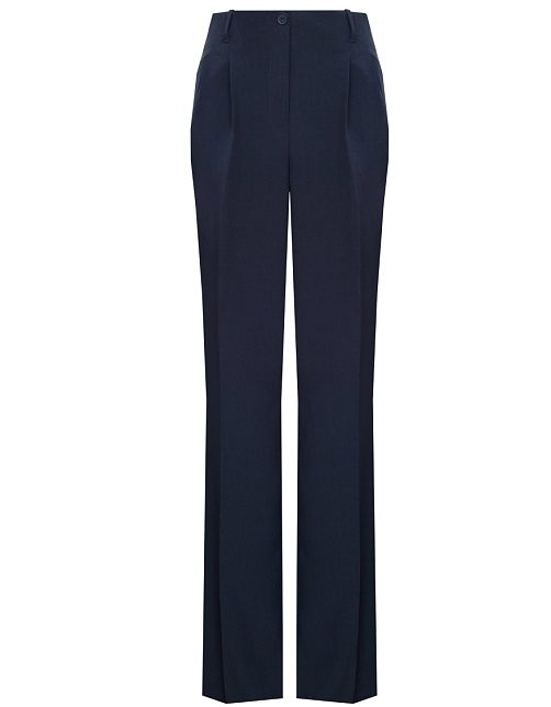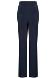 Брюки свободного кроя из костюмной ткани высокого качества темно-синего цвета, который считается универсальным в базовом гардеробе, средняя посадка, без пояса, на внутренней обтачке и шлевками под ремень, застежка на молнию и пуговицу спереди, умеренно объемные в области бедер за счет складок по передней части, боковые карманы с отрезным бочком, заутюженные стрелки, низ обработан от осыпания ткани, но не подогнут - что позволяет скорректировать длину брюк под свой рост, без карманов и подкладки