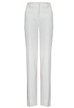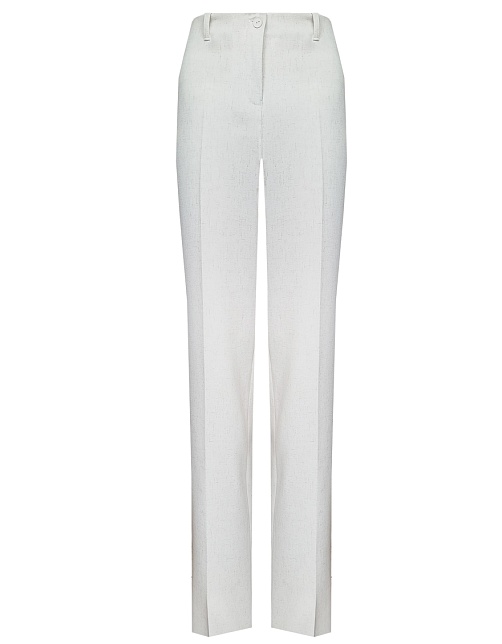 Брюки прямого кроя из поливискозной ткани в мягком жемчужном оттенке с едва заметным переливающимся сиянием перламутрового, модель без пояса, с талиевыми вытачками и шлевками под ремень, посадка средняя, застежка на молнию и пуговицу спереди, заутюженные стрелки, низ обработан от осыпания ткани, но не подогнут - это позволяет скорректировать длину брюк под свой рост, без подкладки и карманов. Брюки из такой ткани не так сильно мнутся, более долговечны, легки в уходе, устойчивы к выцветанию.