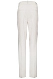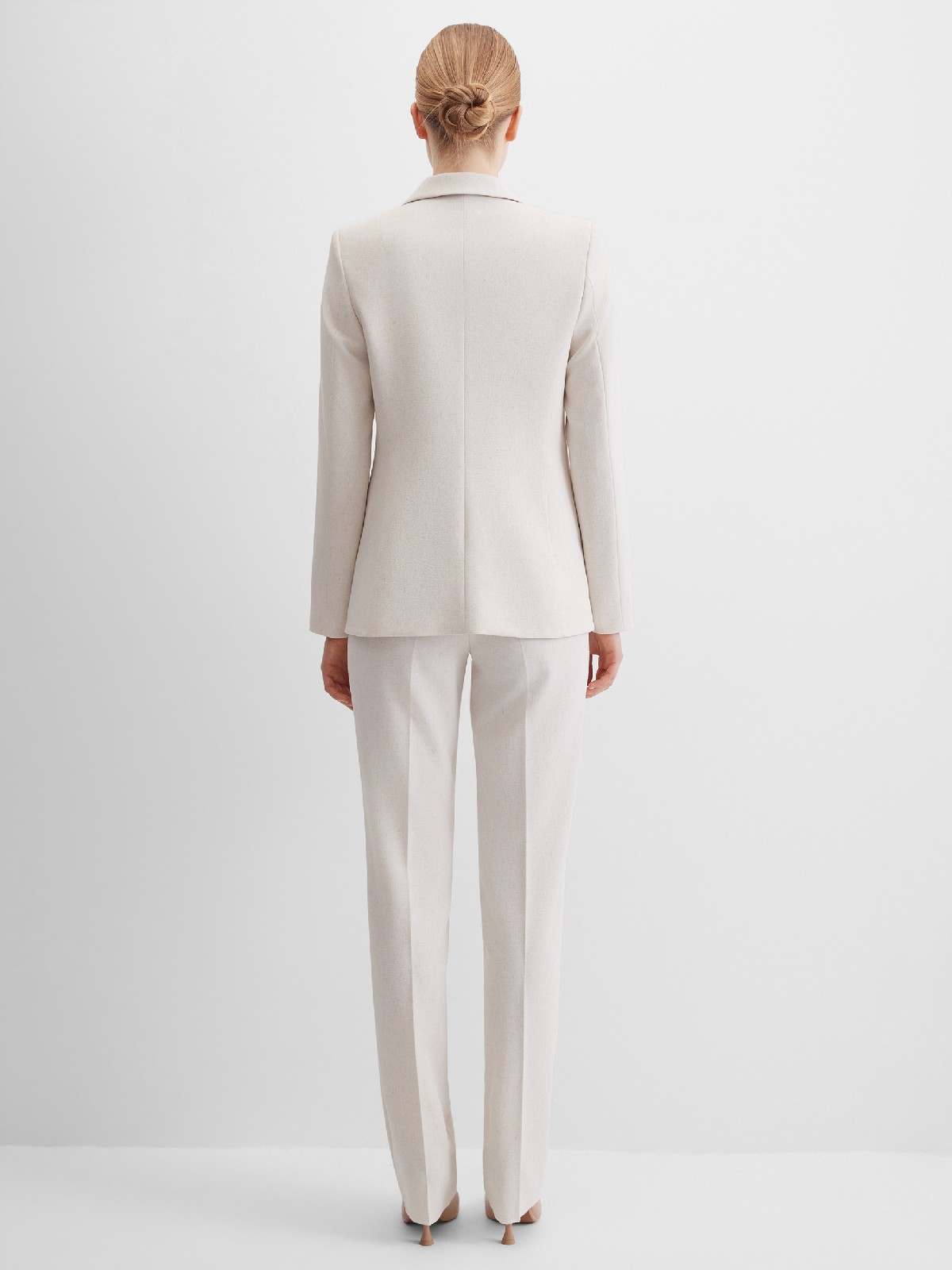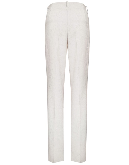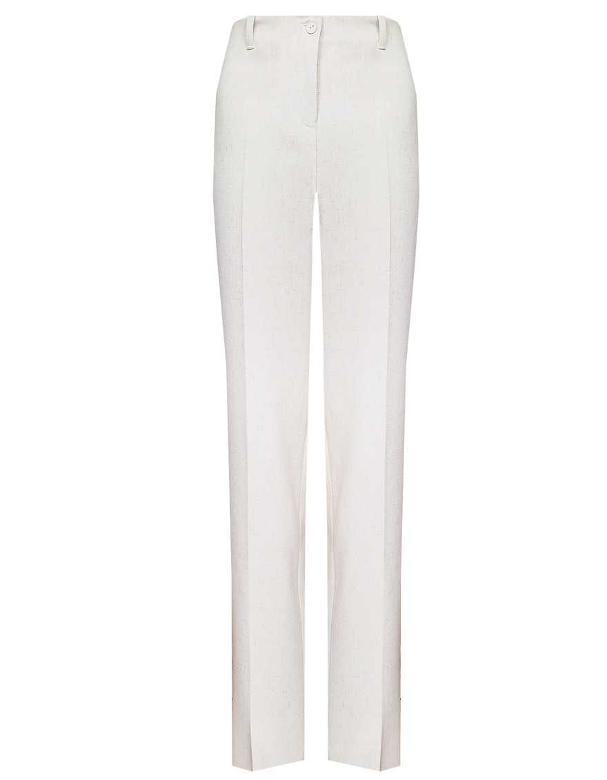 Брюки прямого кроя из поливискозной ткани в мягком жемчужном оттенке с едва заметным переливающимся сиянием перламутрового, модель без пояса, с талиевыми вытачками и шлевками под ремень, посадка средняя, застежка на молнию и пуговицу спереди, заутюженные стрелки, низ обработан от осыпания ткани, но не подогнут - это позволяет скорректировать длину брюк под свой рост, без подкладки и карманов. Брюки из такой ткани не так сильно мнутся, более долговечны, легки в уходе, устойчивы к выцветанию.