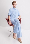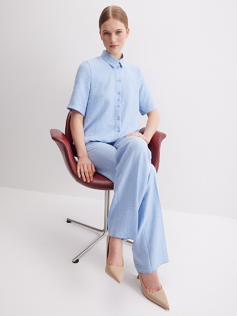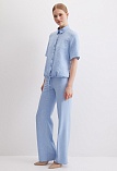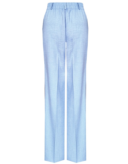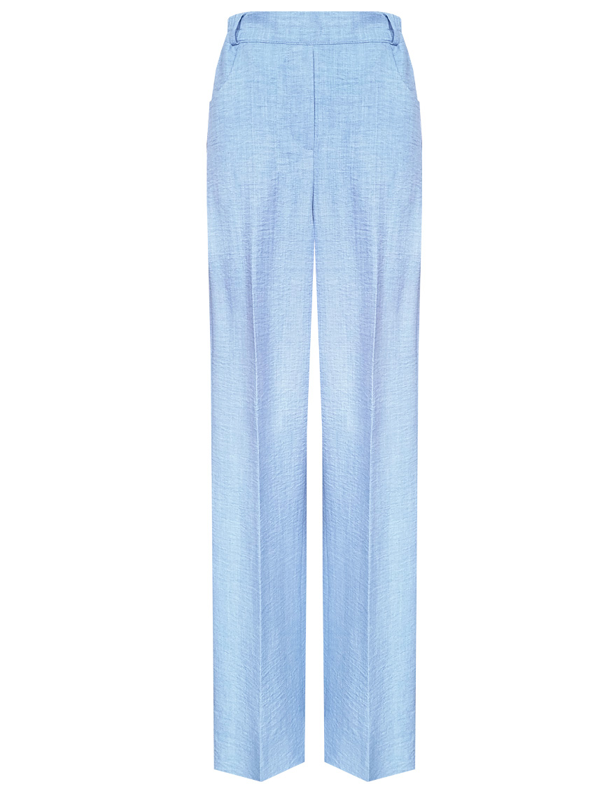 Легкие брюки свободного кроя из смесовой ткани с хлопком и вискозой в нежном оттенке небесно-голубого цвета с легким меланжевым эффектом, на резинке, шлевки под ремень, посадка средняя, имитация гульфика заменяет застежку на молнию и пуговицу, боковые карманы с отрезным бочком, заутюженные стрелки, низ обработан от осыпания ткани, но не подогнут - это позволяет скорректировать длину брюк под свой рост, без подкладки. Такая ткань отлично пропускает воздух, позволяя коже дышать.