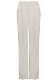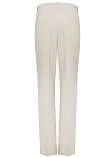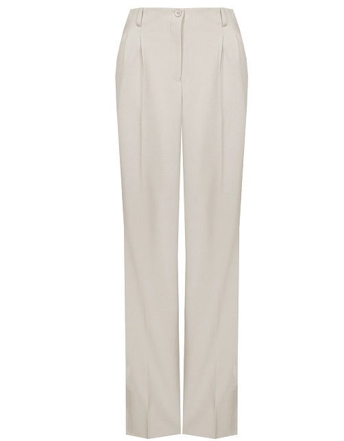 Легкие брюки свободного кроя из смесовой ткани льняной структуры в легком и воздушном сливочно-кремовом цвете, средняя посадка, без пояса, на внутренней обтачке и шлевками под ремень, застежка на молнию и пуговицу спереди, умеренный объем в области бедер за счет складок по передней части, боковые карманы с отрезным бочком, заутюженные стрелки, низ обработан от осыпания ткани, но не подогнут - что позволяет скорректировать длину брюк под свой рост, без карманов и подкладки.