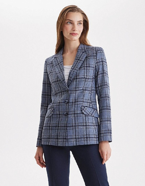 Лаконичный жакет из поливискозной ткани голубого цвета с элегантным переплетением темно-синих и едва заметных белых полос, по своим конструктивным особенностям можно смело отнести к мужскому стилю, удлиненный, приталенный, однобортный, английский воротник, прорезные карманы с клапаном, прямой борт, общий подкройной бочок у спинки и полочки, т.е. без бокового шва,застежка на пуговицы, длинный втачной рукав, тонкие подплечники, модель на подкладке. Фишка модели - безупречная посадка!