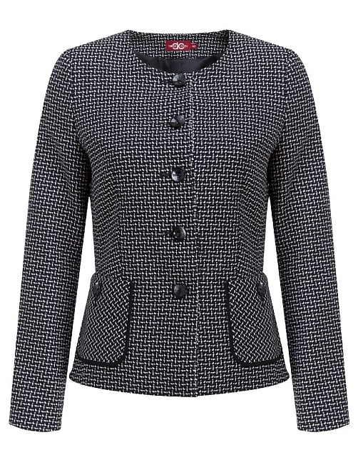 Жакет из смесовой ткани с замысловатой фактурой в виде мелкоузорчатого переплетения черных и белых нитей, средняя длина,  приталенный, однобортный, круглая горловина без воротника, небольшие накладные карманы с кантом по контуру из ткани компаньона и функциональной пуговицей, прямой борт, застежка на пуговицы, длинный втачной рукав, тонкие подплечники, модель  полностью на подкладке.