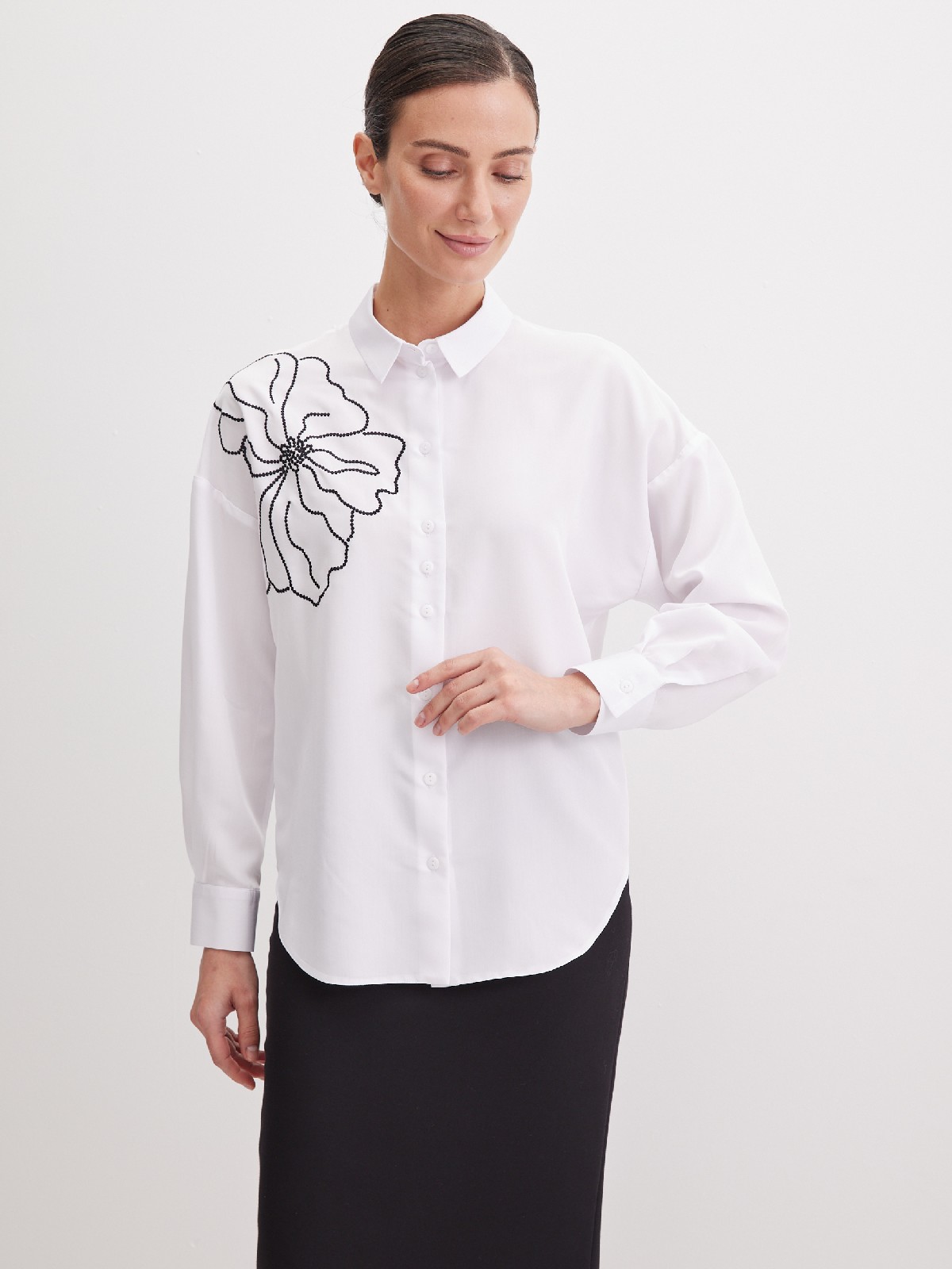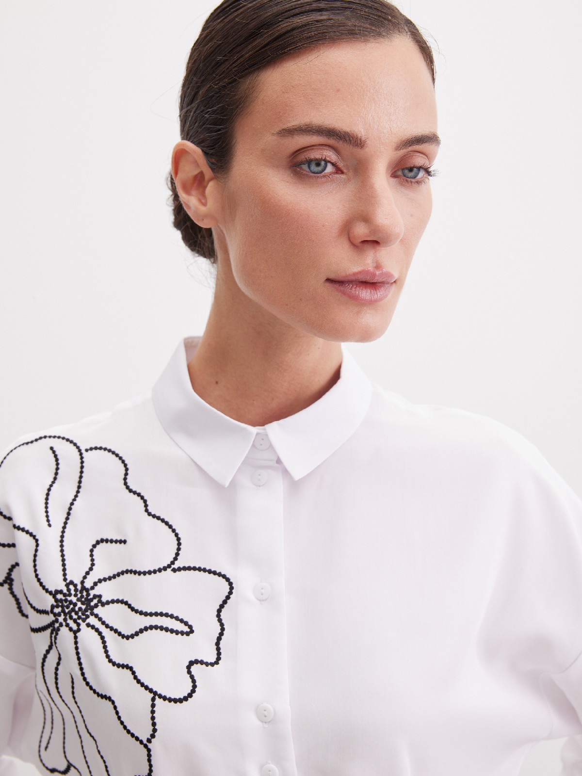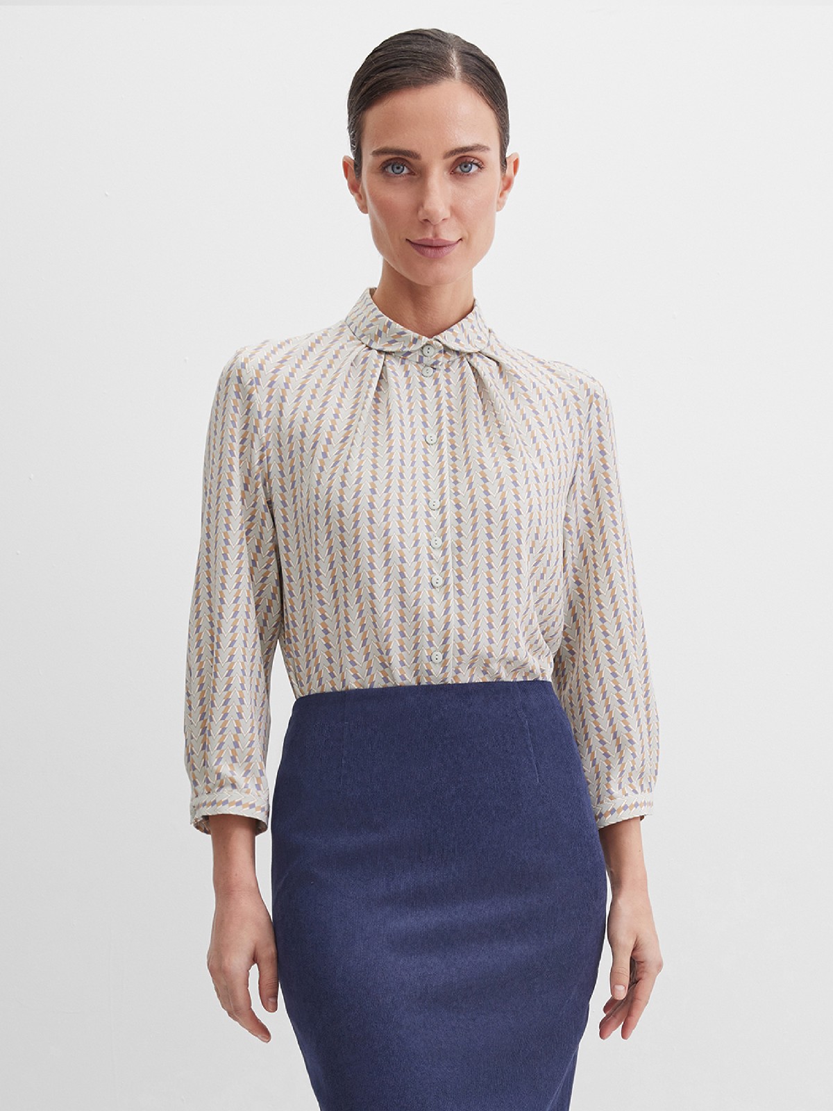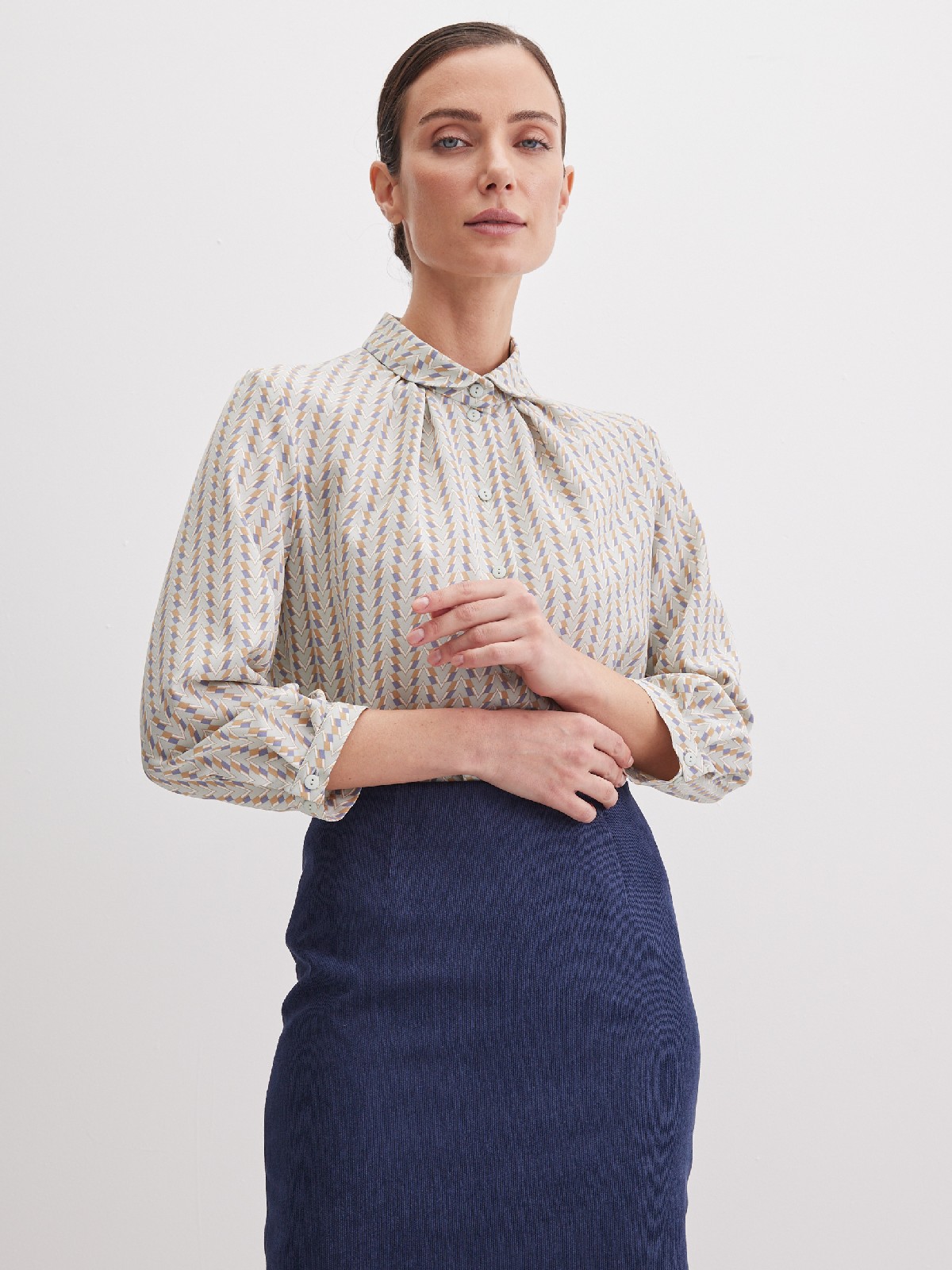 Блузка свободная на резинке с оригинальным вырезом и принтом