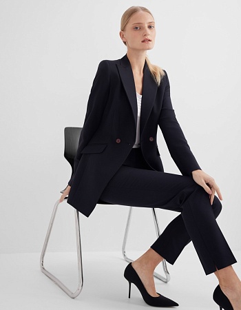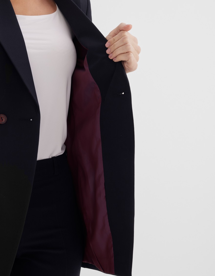 Классический удлиненный жакет из костюмной ткани темно-синего цвета, приталенный,  двубортный, английский воротник с широким острым лацканом, прорезные карманы с клапаном, застежка на одну пуговицу в два ряда, длинные втачные рукава с разрезами позволяют легко менять длину рукава, тонкие подплечники, модель  полностью на подкладке.