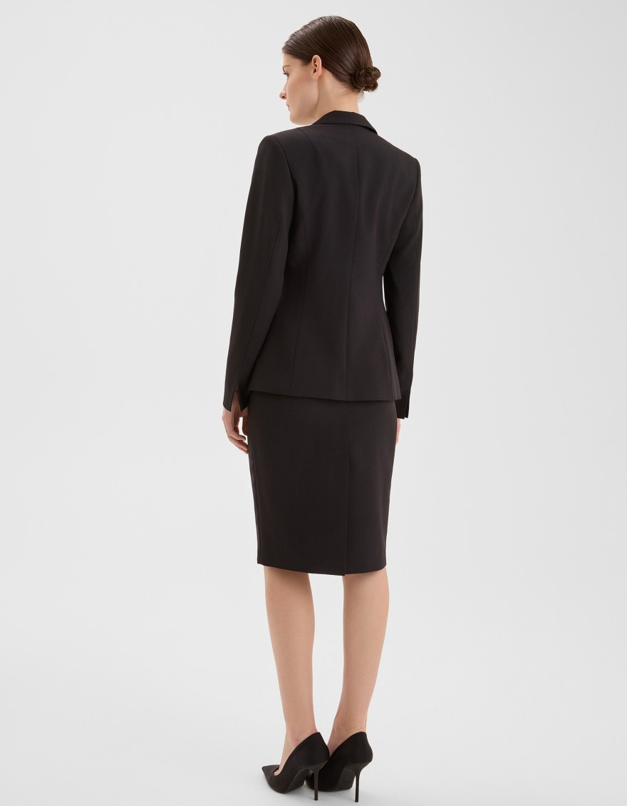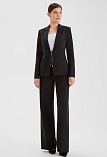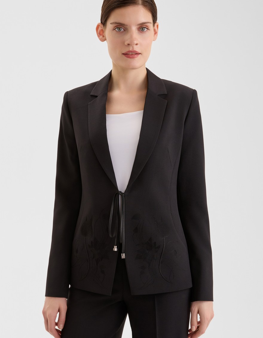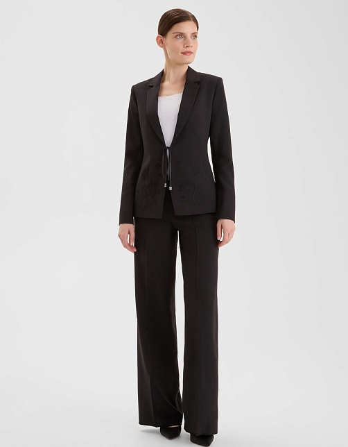 Жакет оригинального кроя в классическом черном цвете с изящной цветочной вышивкой в тон основной ткани. Модель выполнена из костюмной поливискозной ткани, средняя длина, приталенный, английский воротник,  карманы в фигурном рельефе спереди, застежка в виде завязок с декоративными наконечниками, длинный втачной рукав с разрезом, который позволяет менять длину рукава, тонкие подплечники, модель на подкладке.