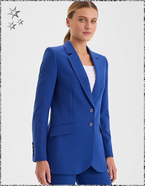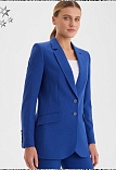 Классический жакет из костюмной поливискозной ткани сапфирового цвета - насыщенного оттенка синего, приталенный, однобортный, английский воротник, прорезные карманы с клапаном, круглый борт, застежка на пуговицы, на спинке шлица, длинный втачной рукав с декоративной шлицей и рядом мелких пуговиц, тонкие подплечники, модель  полностью на подкладке.