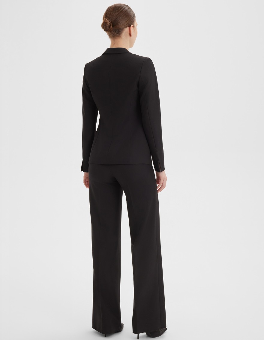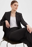 Жакет оригинального кроя в базовом черном цвете из костюмной поливискозной ткани, средняя длина, приталенный, английский воротник,  карманы в фигурном рельефе спереди, застежка в виде металлического крючка, длинный втачной рукав с разрезом, который позволяет менять длину рукава, тонкие подплечники, модель на подкладке. Поливискозная ткань - это смесовая ткань, в состав которой входят волокна вискозы и полиэстера. Именно полиэстер придает ткани прочность, долговечность и опрятный вид.