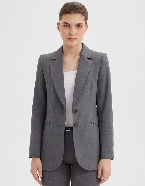 Классический жакет из костюмной ткани вишер с легким меланжевым эффектом  в благородном сером цвете, комфортная длина прикрывающая бедра, приталенный, однобортный, английский воротник, прорезные карманы в рамку с декоративными закрепками по краям, круглый борт, застежка на пуговицы, на спинке шлица, длинный втачной рукав с декоративными закрепками, имитирующие ряд пуговиц, тонкие подплечники, модель на подкладке. Акцент модели - декоративные закрепки ярко-красного цвета.