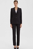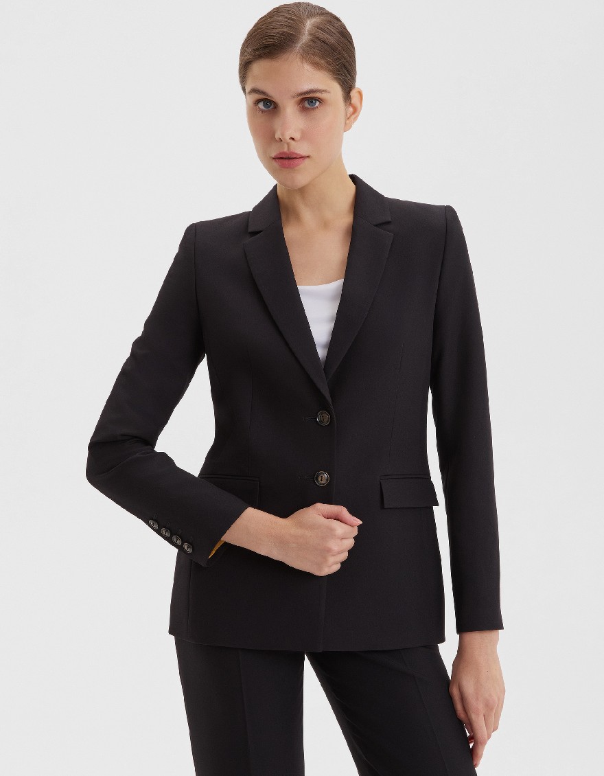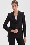 Классический жакет из костюмной поливискозной ткани в базовом черном цвете, приталенный, слегка удлиненный, однобортный, английский воротник, прорезные карманы с клапаном, прямой борт, застежка на пуговицы, длинный втачной рукав, тонкие подплечники, модель на подкладке. Поливискозная ткань - смесовая ткань, в состав которой входят волокна вискозы и полиэстера. Именно полиэстер придает ткани прочность, долговечность и опрятный внешний вид.